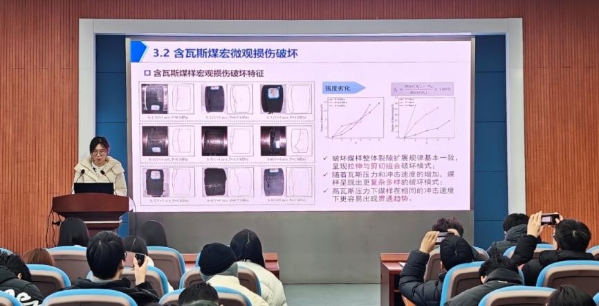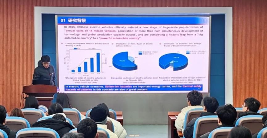 三位主讲人分别围绕安全工程前沿方向展开专题报告。张思清以“动载荷与瓦斯压力作用下煤样力学行为研究”为题,探讨含瓦斯煤体在动载作用下的损伤与裂隙演化规律;胡翔宇聚焦新能源消防安全,围绕“不同灭火剂抑制电池组热失控灭火效能评价”展开分析;李治含以“(超)高层建筑火灾防治的科技前沿与挑战”为题,结合深度学习与火灾动力学,探讨高层建筑火灾防控的关键问题。报告结束后,主讲人与现场同学就科研方法、课题推进与成果转化等话题进行了深入交流。