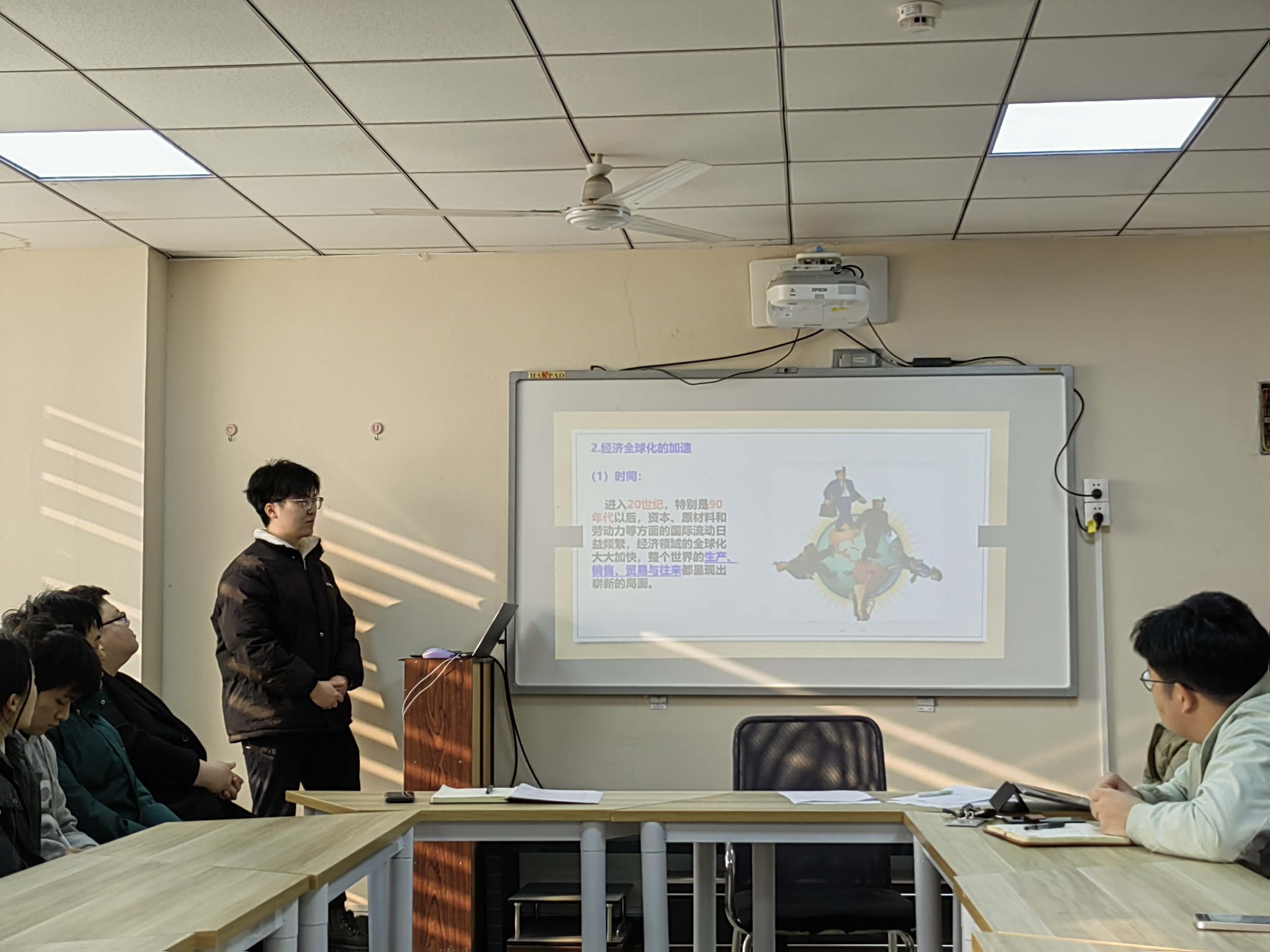 活动伊始,李孟阳同学结合有趣的小故事和科普视频,深入浅出地介绍了经济全球化的定义、历史背景以及给人们带来的便利。他认为,经济全球化是一把双刃剑,作为青年大学生我们要培养爱国主义情怀、沟通意识和实践调研能力。刘世通老师鼓励同学们要树立远大志向,学习知识既要广博又要精深,既要扎根祖国能源行业发展,又要放眼世界拓展思维,不断培养自身跨文化的意识和能力。