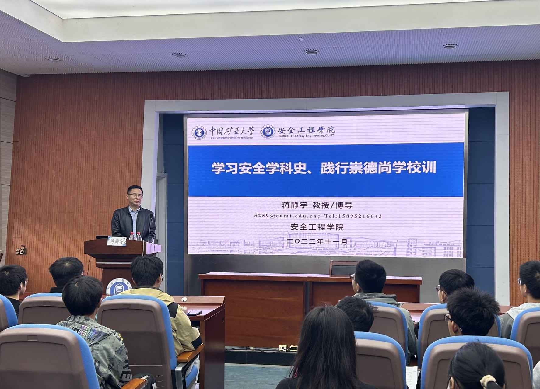 本次“教授有约”活动以“学习安全学科史、践行崇德尚学校训”主题,蒋静宇教授详述了矿业安全学科及安全学院的建立、成长与发展历程,讲述了我国矿业安全学科创建过程中安全前辈们筚路蓝缕、奋力拼搏的艰难岁月,他们不仅建立了安全学科从本科到硕士、博士不同层次的人才培养体系,还完成了全套本科教材的编撰工作。而后重点介绍了安全学院成立以来,安全人围绕国家矿山安全需求,深入矿山一线和矿难现场,理论联系实际,经过多年持续开拓创新,取得了近十项国家级重大科研成果。蒋教授号召同学们要向老一辈安全人学习,热爱专业、学科和学院,并对新时代年轻学子们寄予厚望。蒋教授还结合自身在矿大安全学院的求学、工作经历,对同学们提出“多读书、多运动、多进取”的要求,激励学生们能成长为新一代“安全人”,践行“崇德尚学”校训,为我国安全事业多做贡献。讲座后,蒋教授与同学们针对专业选择、学习规划、身份转变、职业规划等方面开展了讨论与交流,并给出相关指导意见,鼓励同学们通过聆听学术讲座、参加科研创新活动及与老师沟通等方式加深对所学专业的了解。