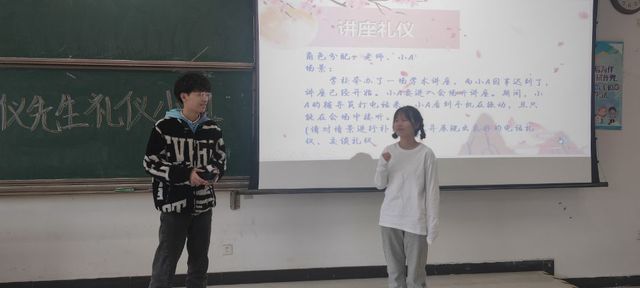 此次活动以男女生组成一组,共三组进行比赛。由主持人郭晓莉和郝映雪讲解活动流程并介绍评委。活动分为两个环节,每个环节50分,第一环节每队轮流上台自我介绍,结束后抽签进行场景模拟表演,三组都以准确的礼仪文化形象表演了具体的场景。台下评委卢笛老师、胡缤文和吴玉洁根据队伍着装、礼仪文化展示等方面进行打分。第二环节三队一同在台上进行礼仪知识抢答,答对积一分,答错其余两队各积一分。每位选手都以积极的态度投入到比赛之中,展现出扎实的礼仪文化知识。最终主持人统计各队总分并选出两位代表学院参赛。