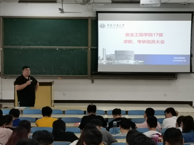 研究生培养的相关信息,分享了她对考研和保研的看法,并对同学们的疑惑进行认真解答。她表示,安全学院能够为想要继续深造的同学提供良好的科研平台,欢迎同学们报考。接着,莫达老师对安全学院2020届毕业生的毕业去向进行了介绍,并提醒同学们要合理规划时间,积极主动准备。2017级求职成功的同学代表也上台分享了他们的求职经验。