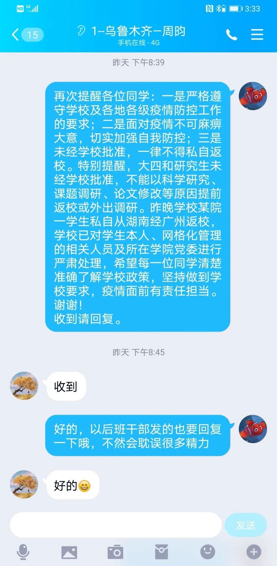 网格员在开学前积极对接协助辅导员排查管理工作,采取电话、QQ、微信等方式,动态掌握全体学生身体健康情况变化,出现异常情况及时汇报,做到不落一班、不漏一人、不留死角。同时,积极利用微信群、QQ群等做好健康知识宣讲和心理疏导等服务,发挥网格化管理优势,有效提高疫情防控效果。