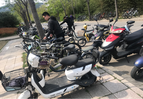 的志愿者们在梅苑、兰苑、图书馆、矿科楼门前以及三食堂门口开展志愿活动。在这次志愿活动中,志愿者们将规定区域停放的电动车、自行车摆放整齐,在美化校园环境的同时方便同学们骑车出行。
