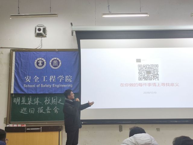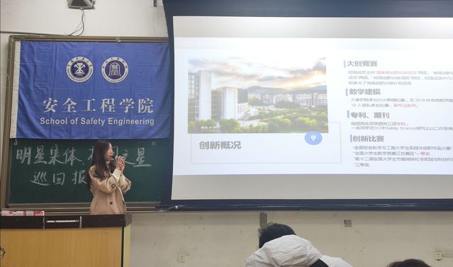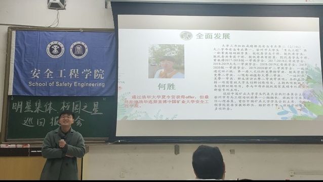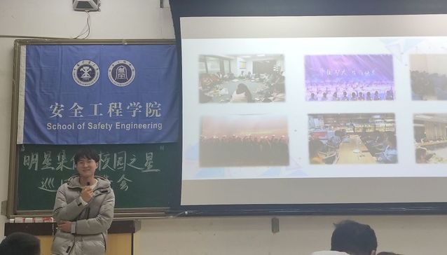 下午4时,报告会正式开始。四位校园之星和两位明星集体代表分别从不同的角度介绍了自己大学期间的收获和学习生活感悟。星级宿舍代表何胜介绍了宿舍成员优秀事迹及宿舍特色学习方式,并向同学们传授了宿舍内互帮互助,共同进步的方法。明星班集体代表王路宇从班级基本情况、班团学风建设、科研成果及特色活动四个方面展示了安全18-5班的风采,树立了模范班级的正确榜样。自强不息之星邵旭结合自身经历,用优异的成绩和丰硕的成果向同学们展现了自强不息的奋斗精神。学术科研之星李逸舟通过分享自身科研事迹,为同学们讲述了科研的意义和价值,激发了同学们对科研的兴趣。社会活动之星袁满为同学们讲述了他的学生工作历程,同时也指出并纠正了同学们关于学习工作的一些错误认知,引导同学们正确规划大学生活。学习优秀之星毛佳伟介绍了自己高效的学习方法,激励同学们以积极乐观、敢作敢为的态度投身到学习生活中去。