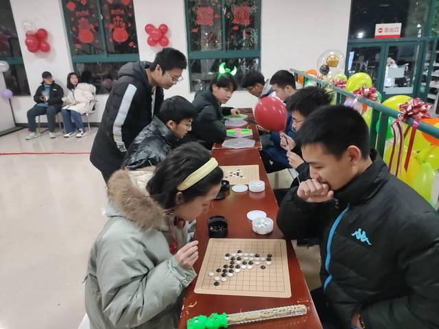 迎新年“游艺宫”活动包括“欢乐套环”、“手忙脚乱”、五子棋等七项游戏及奖券兑换活动。这些游戏趣味性十足,既有个人的斗智斗勇也有团队之间的配合,同学们都热情地参与其中,领取了丰厚的奖品,现场一片欢声笑语。各个部门的布置别出心裁,一整天的精心布场让夜晚的梅三庭院绚丽多彩,每个细节灌入的是大家迎接新年的喜悦。同学们在游玩中缓解了期末复习迎考的压力,展现了同学们活力四射的精神风貌。
