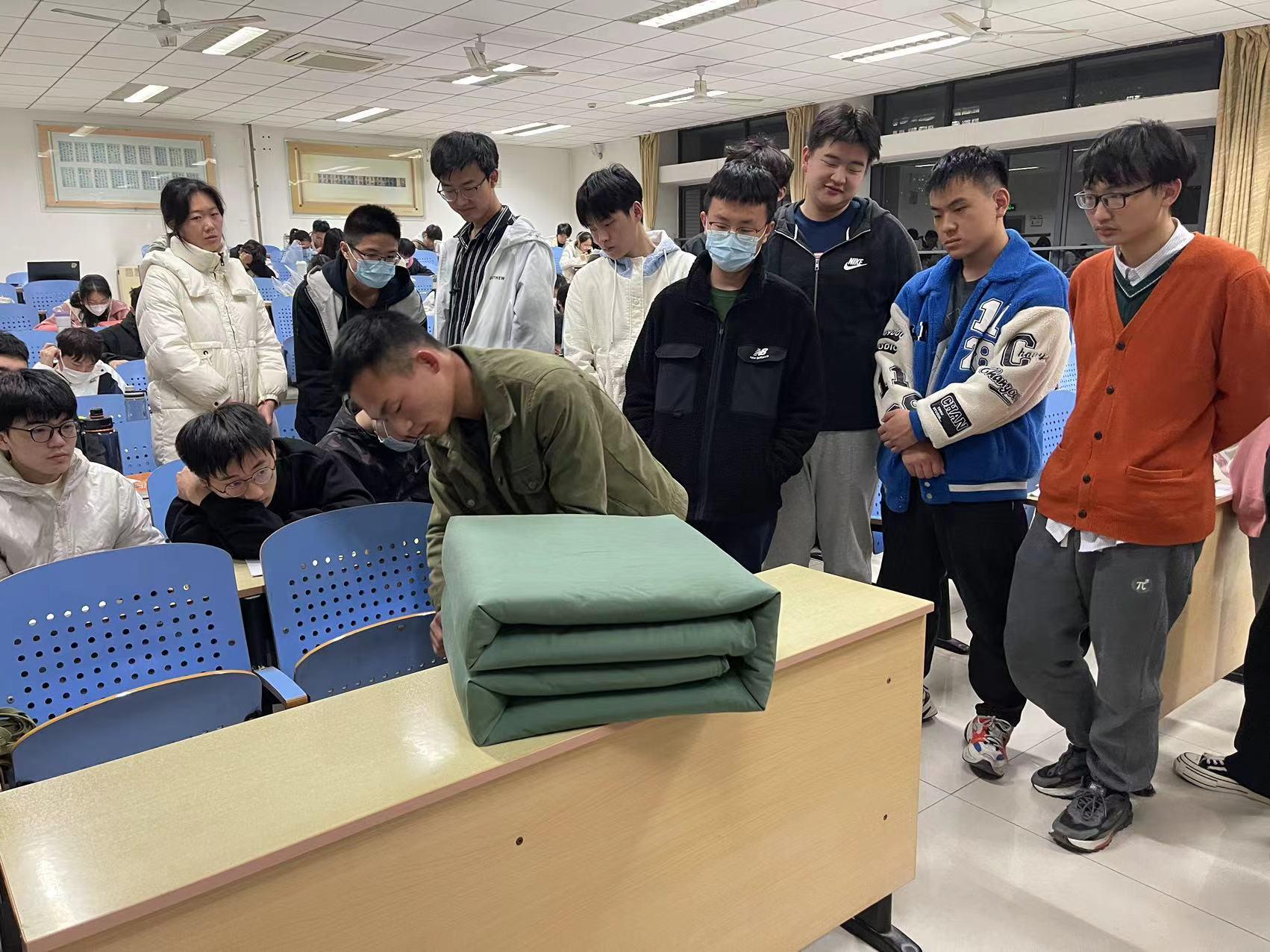 活动伊始,21级辅导员助理杨腾锐为大家介绍了军训的考核标准以及分数组成,强调内务是重中之重,由负责人每周检查,最终按照3:4:3的比例进行考核评级。接着,三位教官向同学们讲解了军旅生活和军队中的“三大条令”——队列、内务、纪律,解答了大家对军中生活得好奇。同时,他们呼吁大家认识条令、学习条令,将这些知识牢记于心中。其次,三位教官拿来军用被,传授叠被子的方法与技巧。他们将被子平铺在课桌上分成三折,在距被子顶端两扎长的位置间距一拳开始压痕,然后用手捏住两端,捏出拱桥形。教官抓住被子的一端竖向折到被子中间,再把边角进行简单整理,重复一次叠好另一边,再在被子最中间一扎宽的位置压痕,形成被子的后墙,整理叠好。整理出大致形状后,胡垚教官用一张卡片将边角对齐,被子像“豆腐块”一样方正整齐。最后,同学们经过一番仔细观察与学习后都跃跃欲试,在教官们的指导下进行尝试。大家纷纷表示在此次条令学习中了解了军规军纪,拓宽了视野。