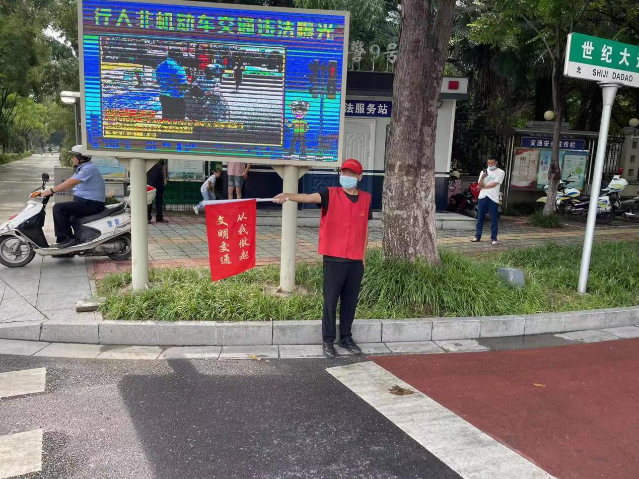7月26日,实践团成员参加了由宿迁市创文办、市公安局、团市委、市志愿者总会组织的“宿迁市市区文明交通志愿服务活动”。实践团成员刘天宇身着“文明交通志愿者”马甲,手持劝导旗,于世纪大道与洪泽湖路交叉路口9号灯岗劝导行人通过马路,协助交警疏导交通,并对行人闯红灯、行人走机动车道、非机动车走机动车道等交通违法行为进行劝阻、纠正。