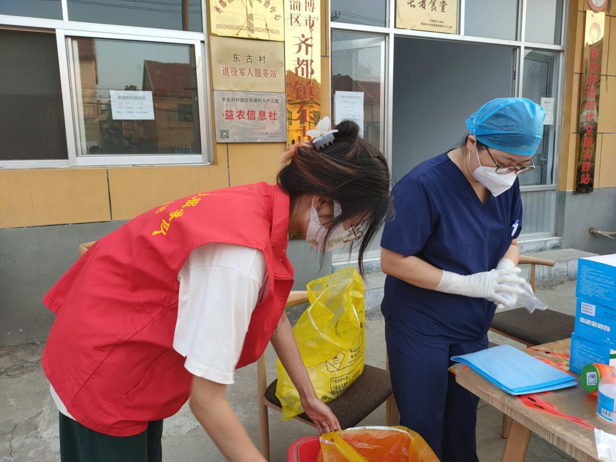 为协助防疫工作,7月16日-7月19日,实践团成员张宇琦、李玥瑶争当防疫志愿者,积极参与当地的“全民核酸”活动,为防疫助力。在安徽省光明市苏巷镇苏巷村,实践团成员张宇琦协助布置核酸检测场所,放置一米线,组织居民有序等待进行核酸检测。在山东省淄博市临淄区东古城村,实践团队成员李玥瑶在完成场地布置后,现场引导老人前往办公室打印身份码,方便老人扫码登记。