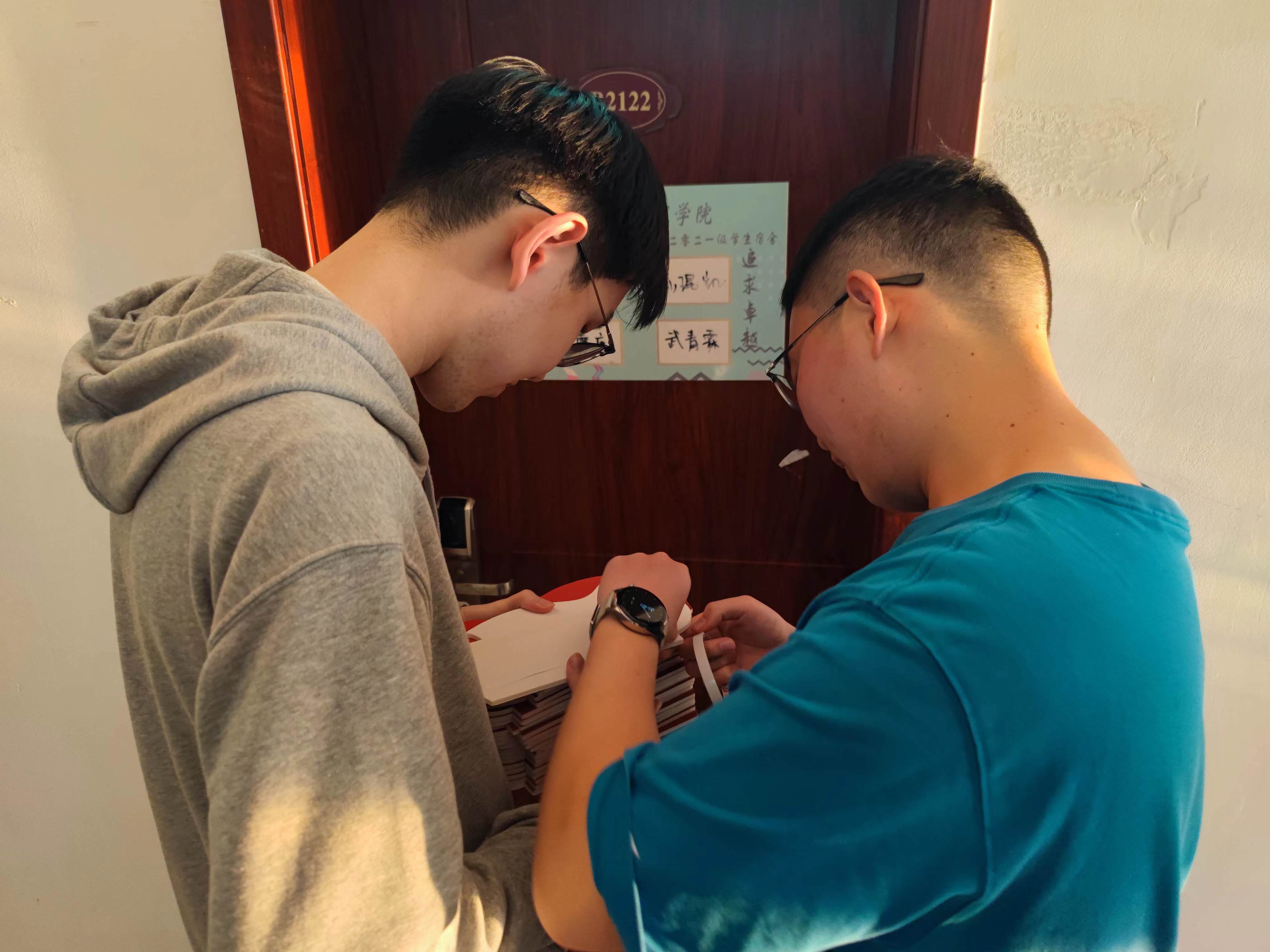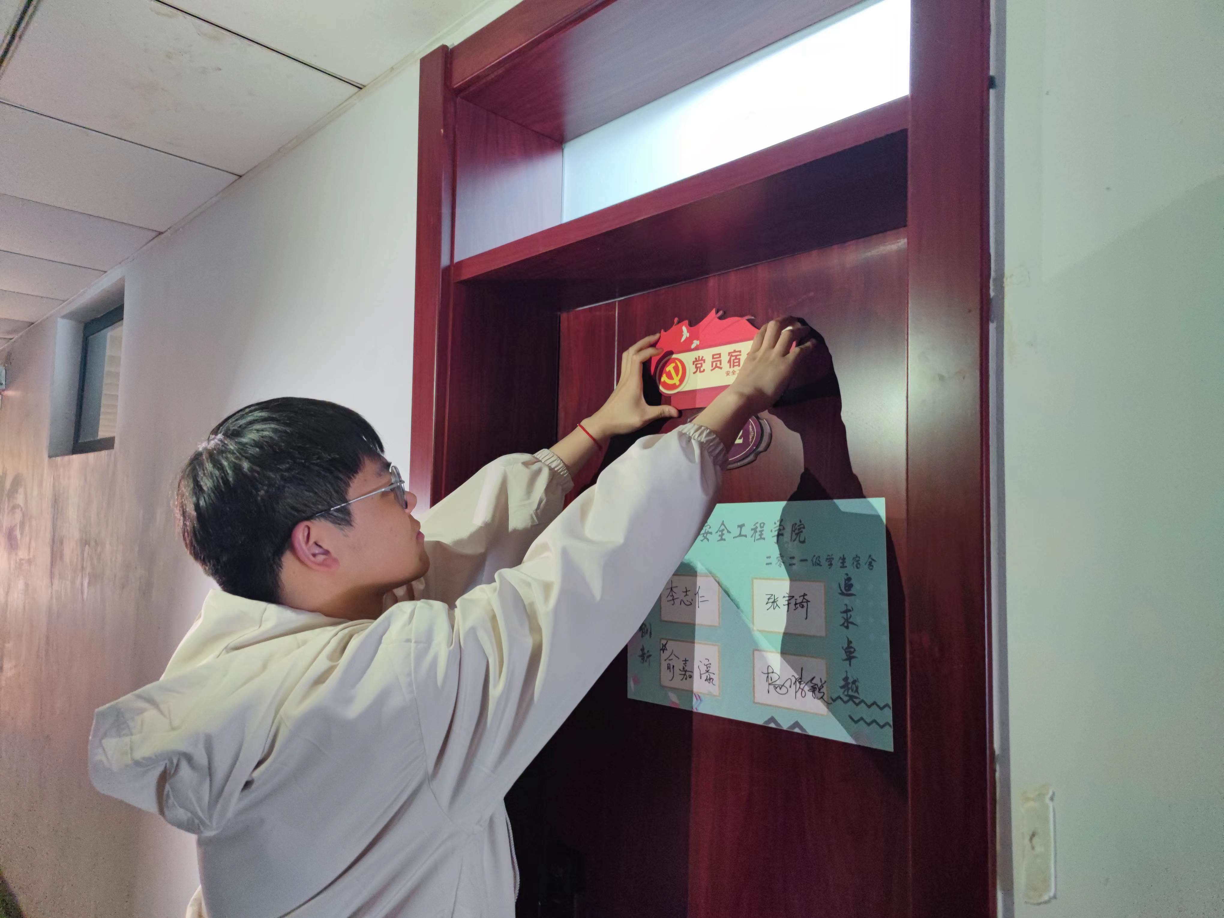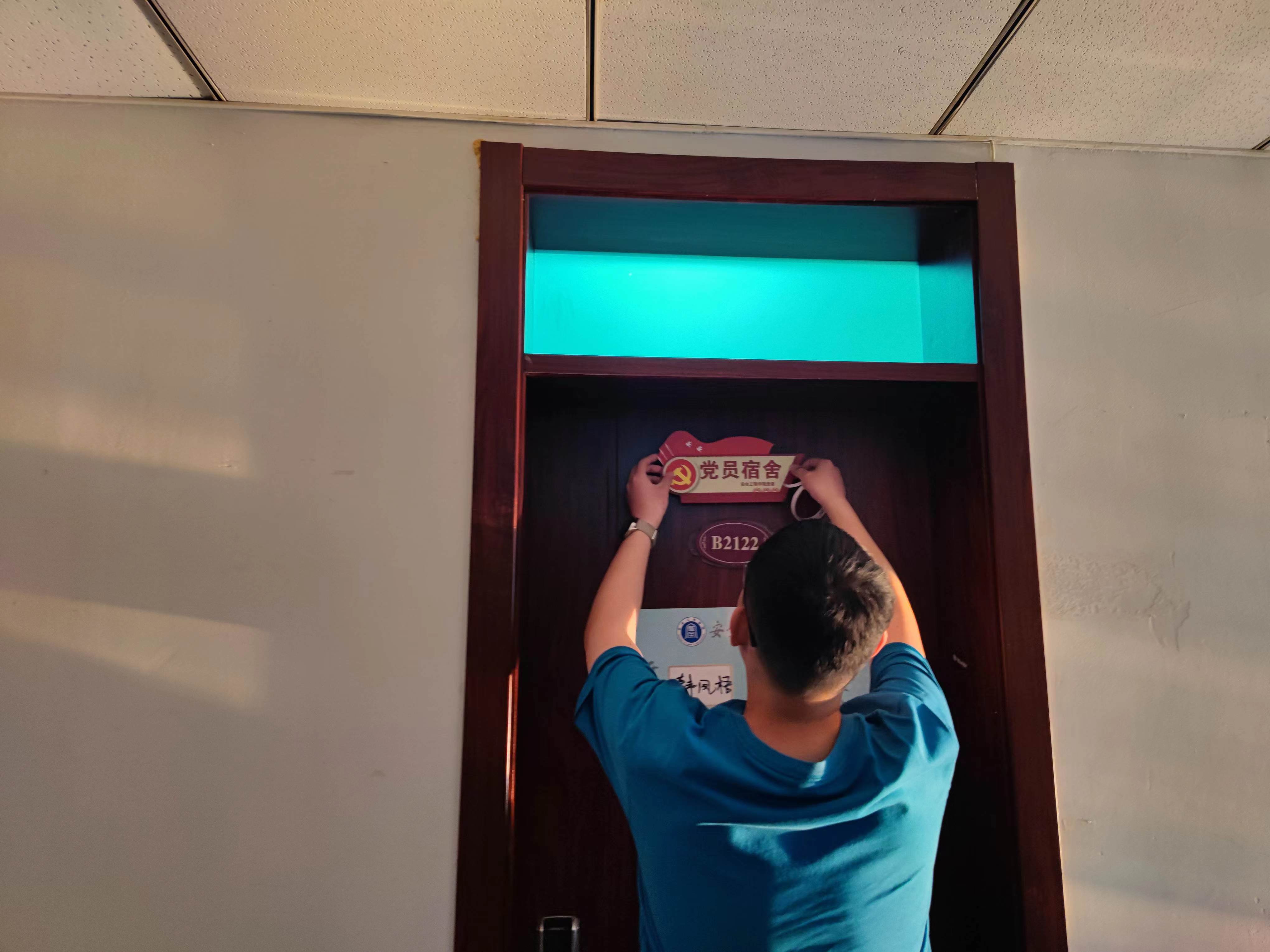 学生党员工作站组织学生党员为新发展的预备党员所在宿舍粘贴铭牌,并与预备党员展开交流,了解宿舍情况。