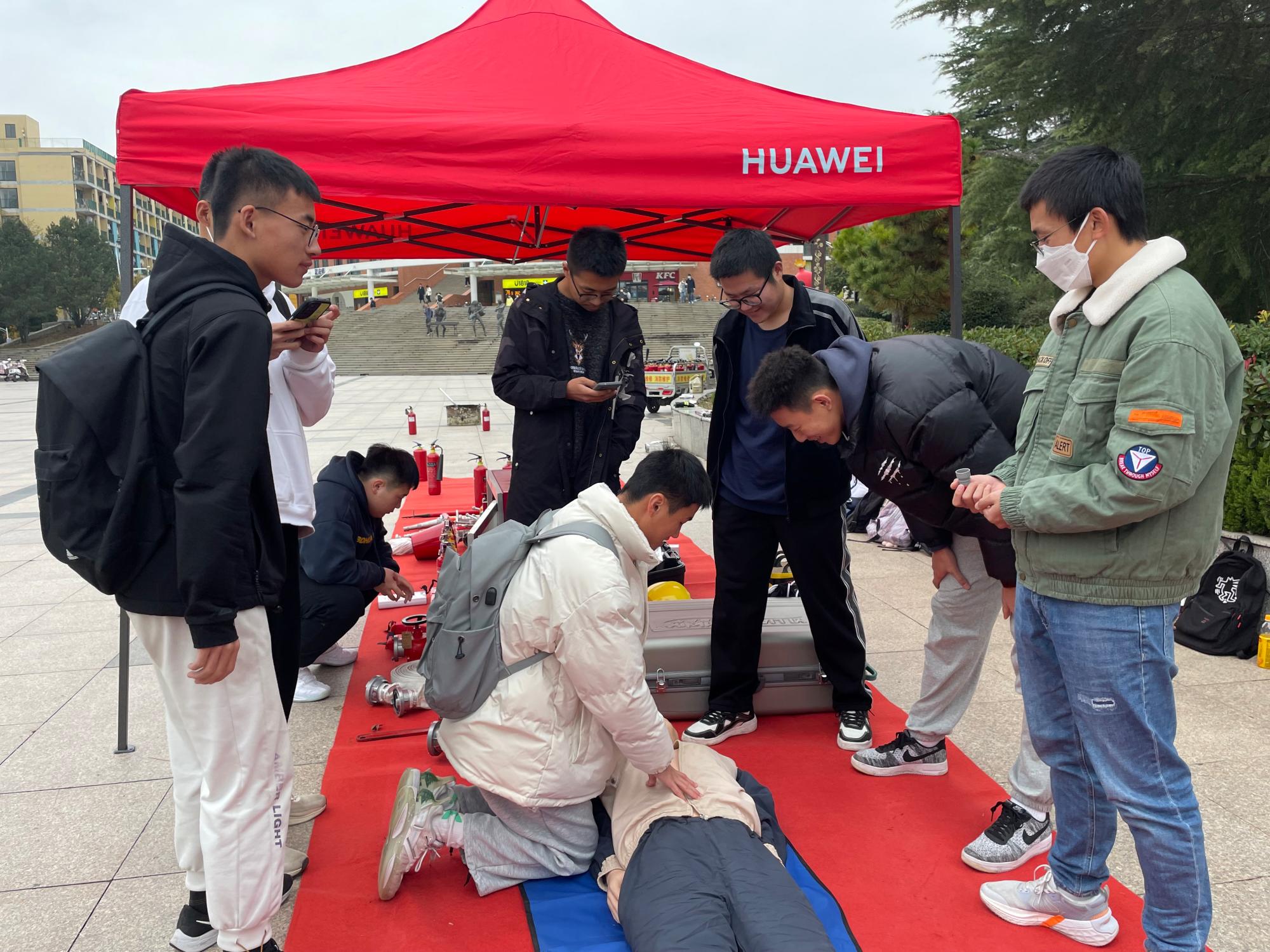 本次消防月嘉年华活动分为七个展示区:火灾逃生及救援体验区、消防装备器材展示及体验区、灭火体验区、消防知识竞答区、趣味竞技区、奖品发放区和消防作品展览区。师生可以自主选择项目参与,完成任一项目可获得工作人员的盖章,盖章总数达到五个时,即可前往奖品发放区进行抽奖。针对理论知识方面,现场设有校园消防安全常识、消防器材使用、应急逃生技能答题点和消防创意海报等作品展览区,让大家学习消防常识。在工作人员为师生讲解装备器材的功能及使用操作之后,大家可以前往消防知识趣味竞技区,巩固消防知识。针对实践操作方面,师生可以进入“逃生屋”,模拟感受火灾发生时的紧张氛围,学习逃生方法,还能亲自动手实施心肺复苏和急救操作。此外,师生还可以亲身体验消火栓连接、穿戴消防战斗服、背空气呼吸器、打消防绳结以及使用二氧化碳灭火器等,增强对消防装备的了解。