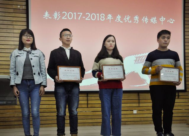 2017-2018“优秀大学生传媒中心”评选中荣获“活动先进大学生传媒中心”奖项。安全学院新闻宣传中心主任邓倩代表学院上台领奖。