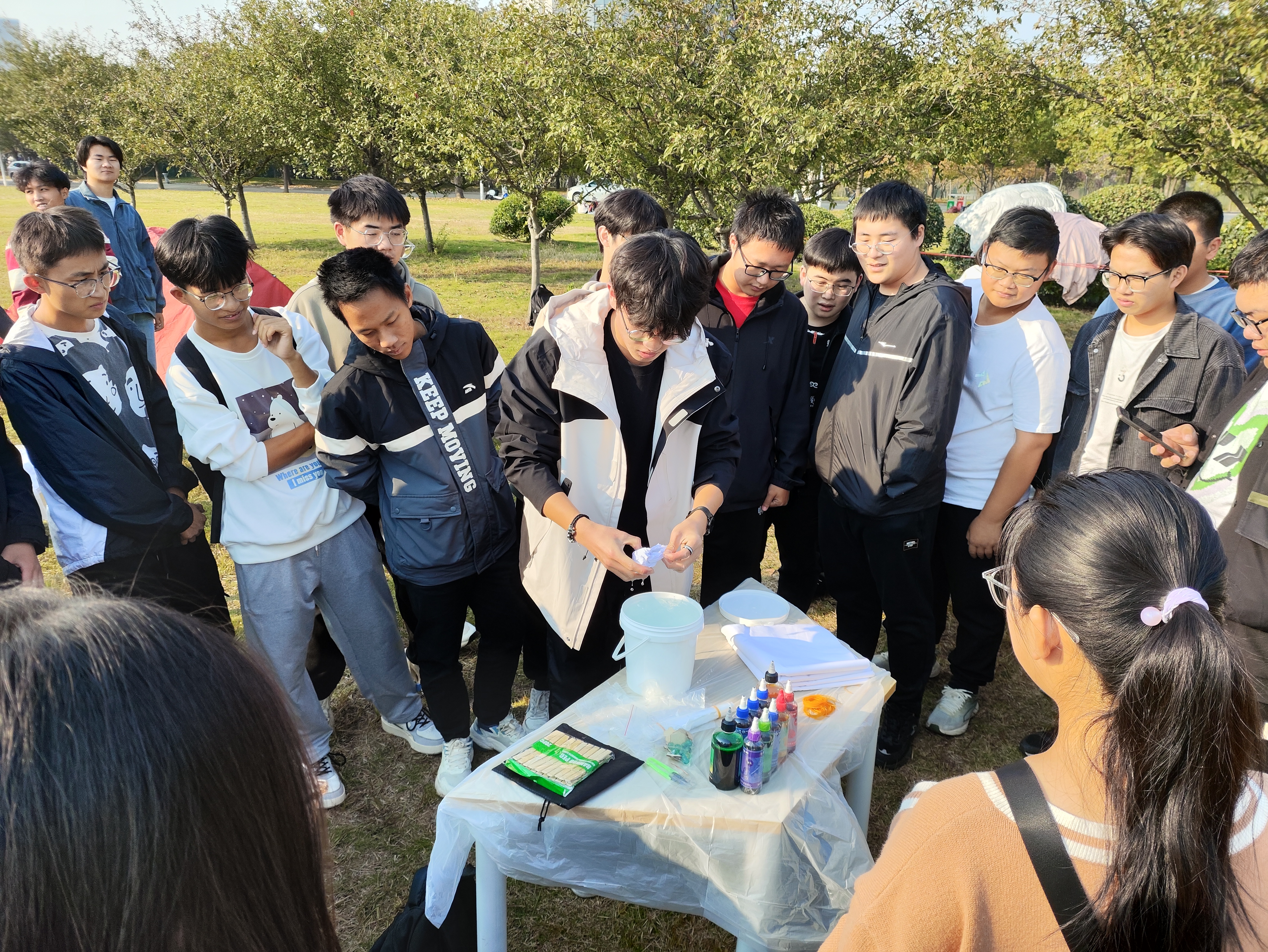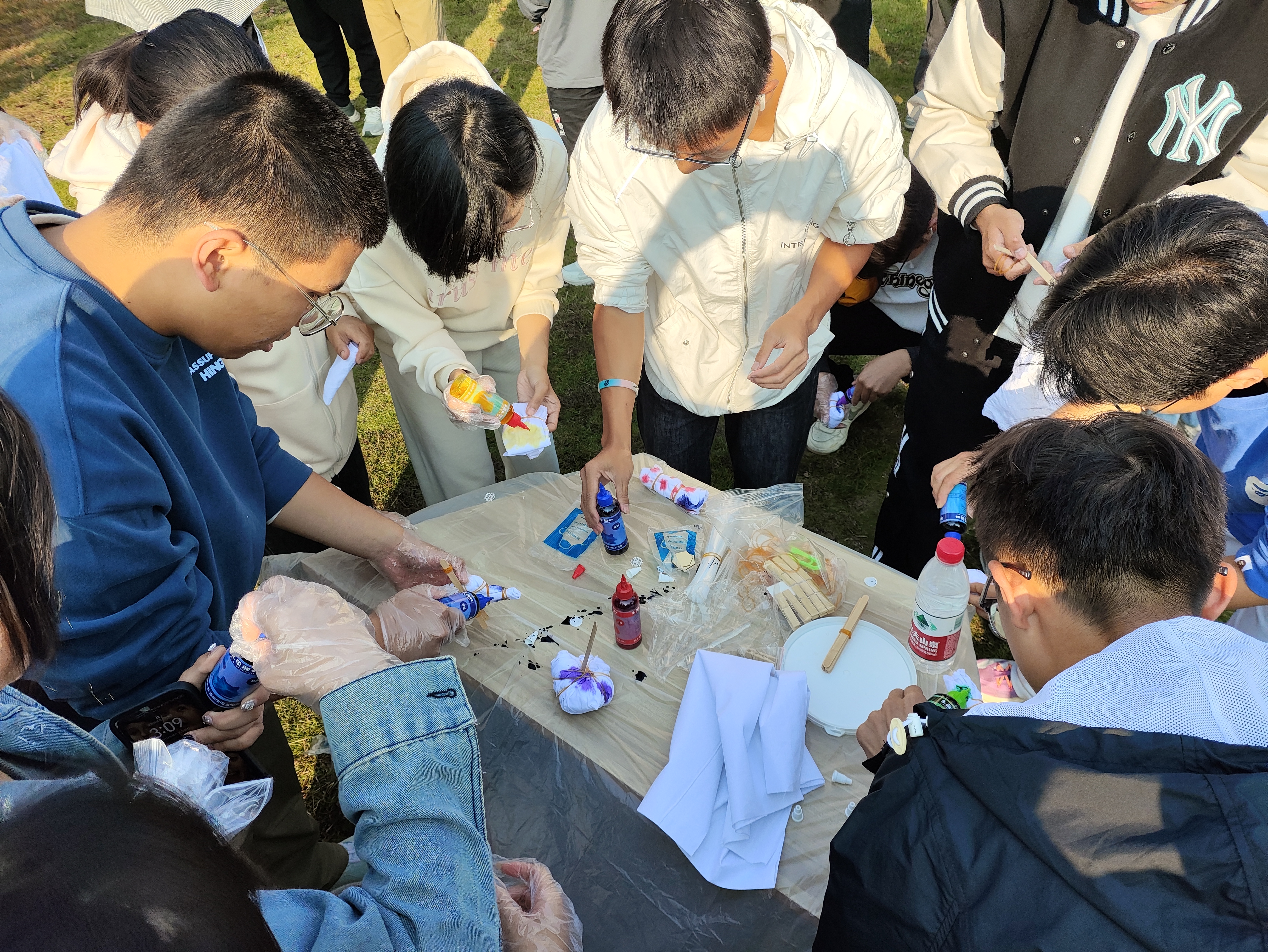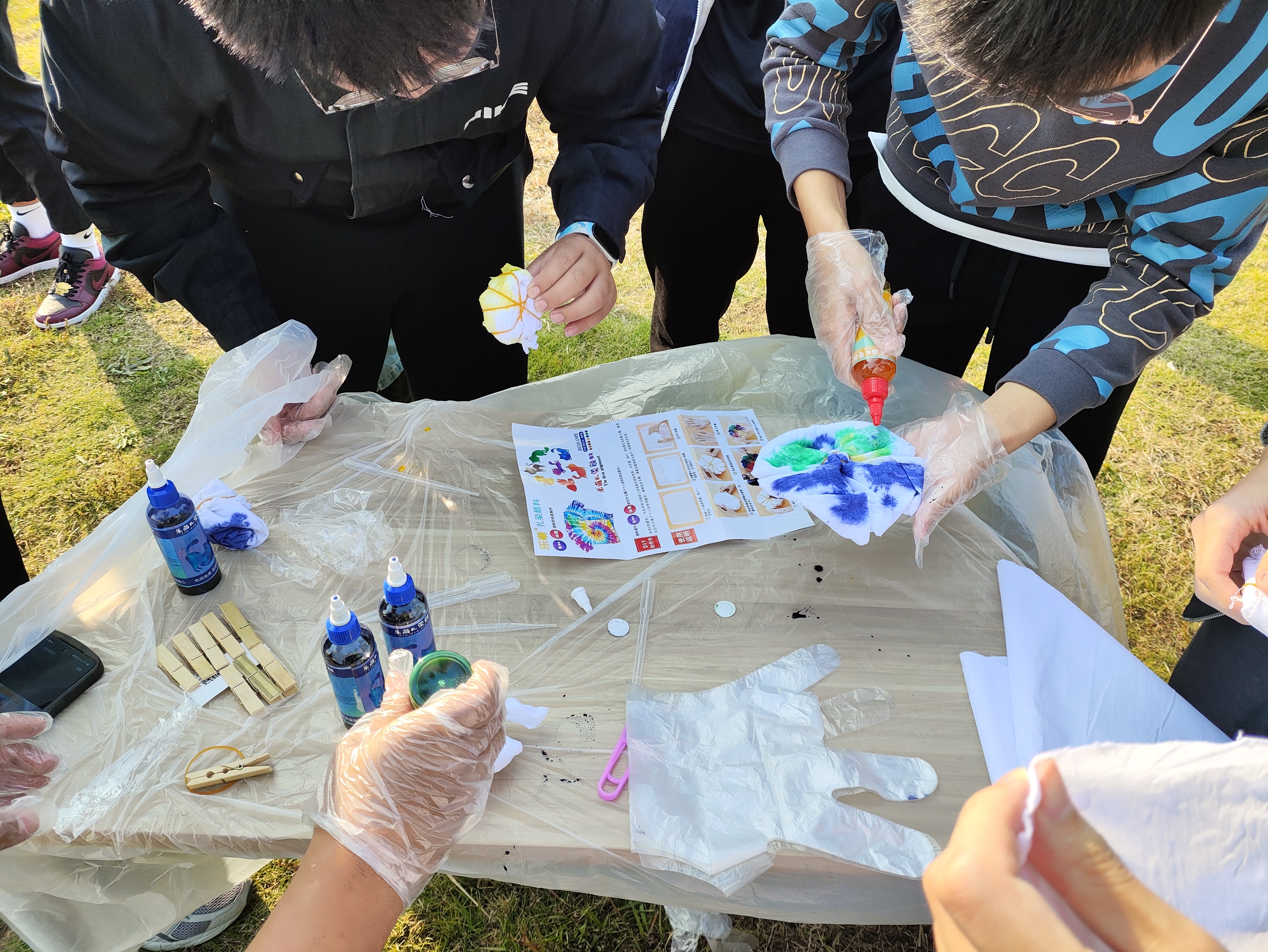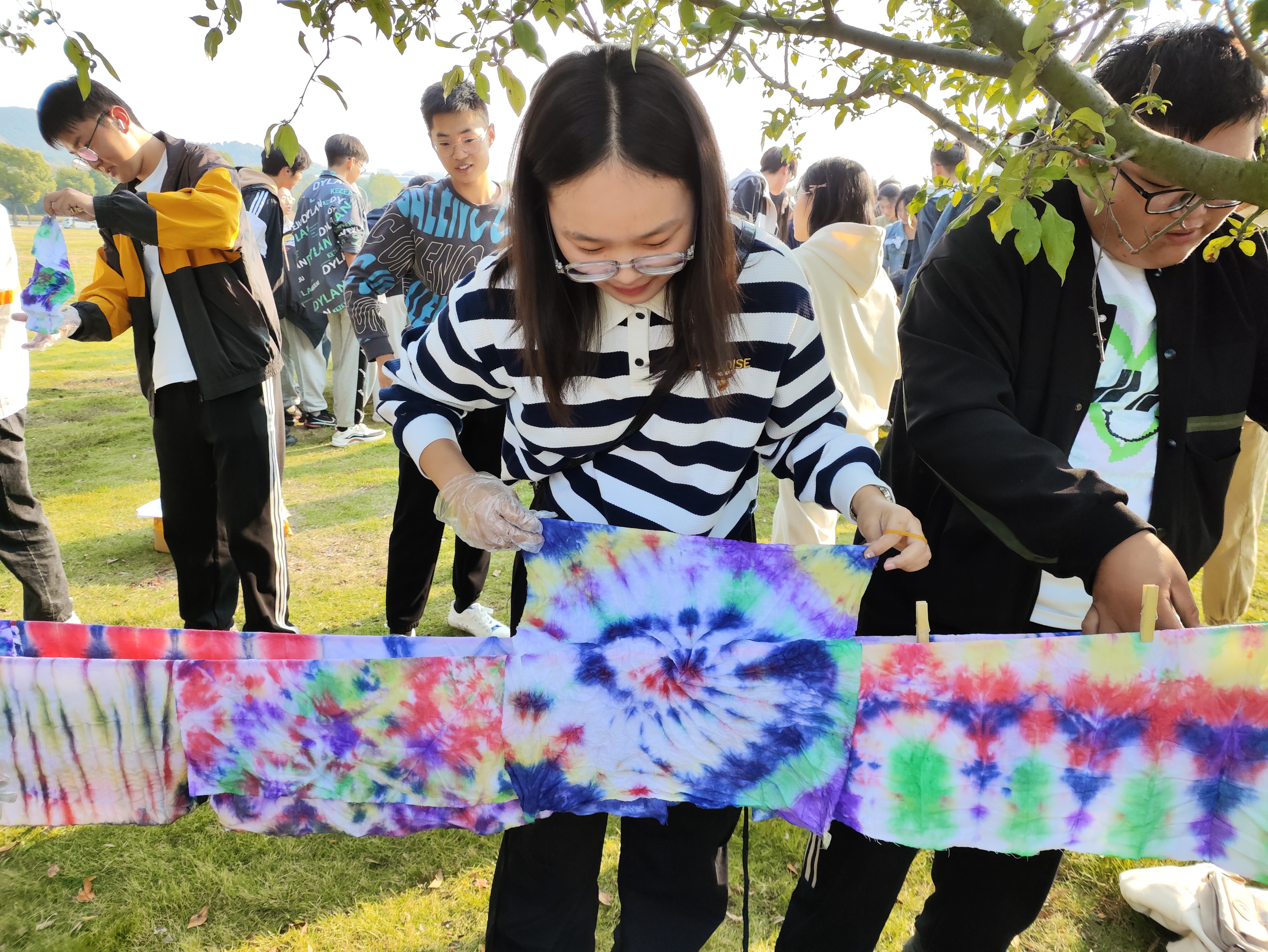 活动当天,同学们在工作人员的帮助下,学习了扎染的基本原理,逐渐掌握了扎染的技巧。参赛同学用手指、绳子、橡皮筋等多种方法将布料捆绑起来,将其浸入不同颜色的染料中进行染色。同学们在白色的布料上尽情展现独特的个性与创意,创作出了许多独具特色的作品。活动现场洋溢着轻松愉悦的氛围,同学们相互交流,分享经验,互相鼓励,互相帮助,既享受着创作的乐趣,也感受到了传统文化的魅力和价值。
