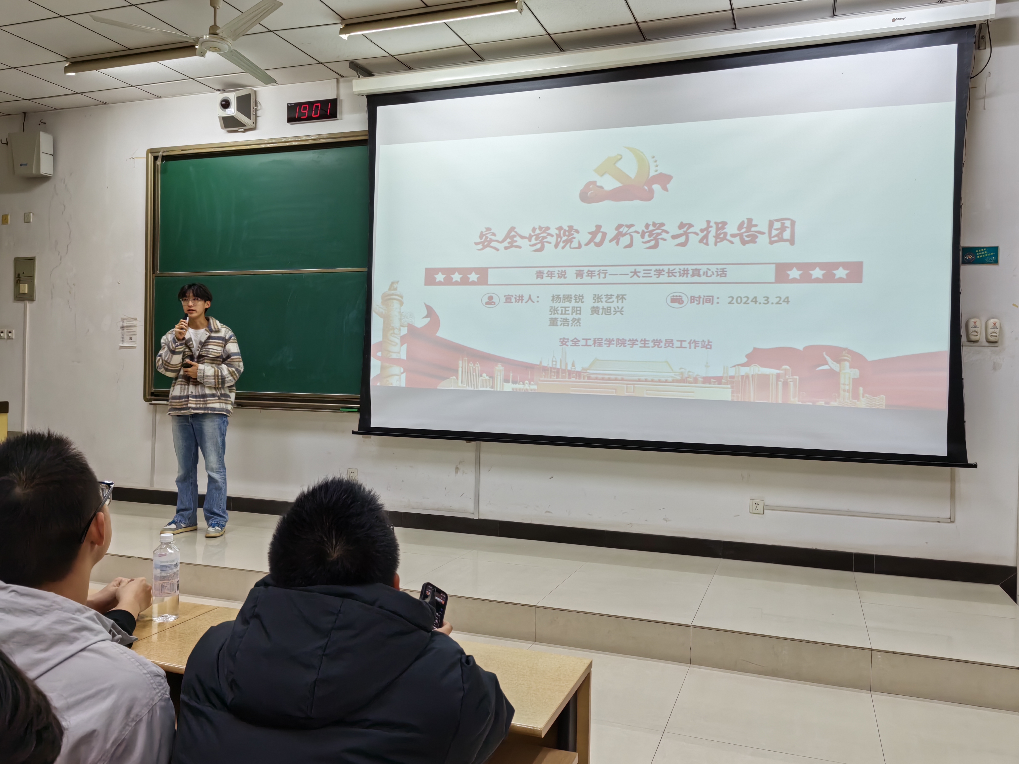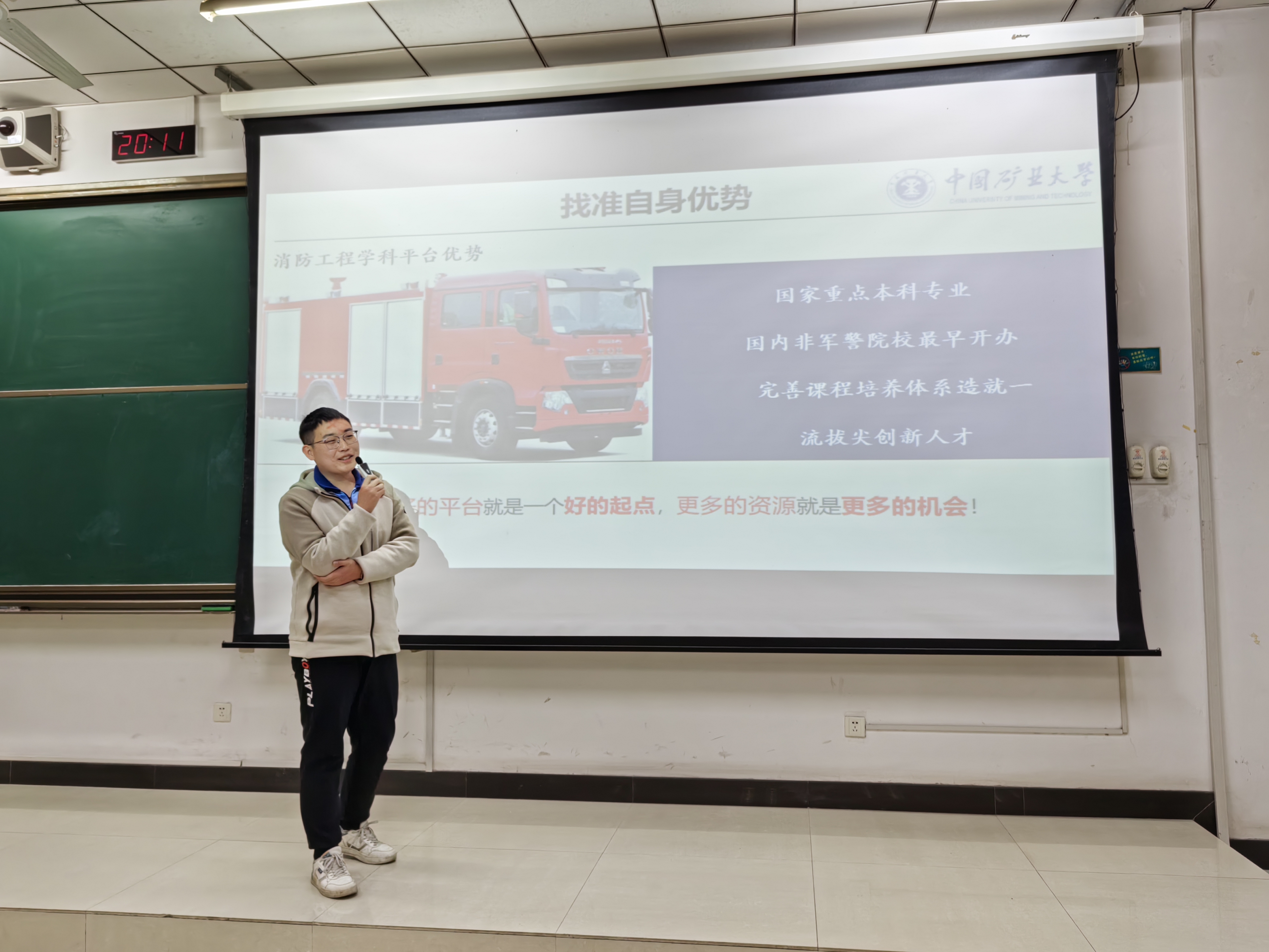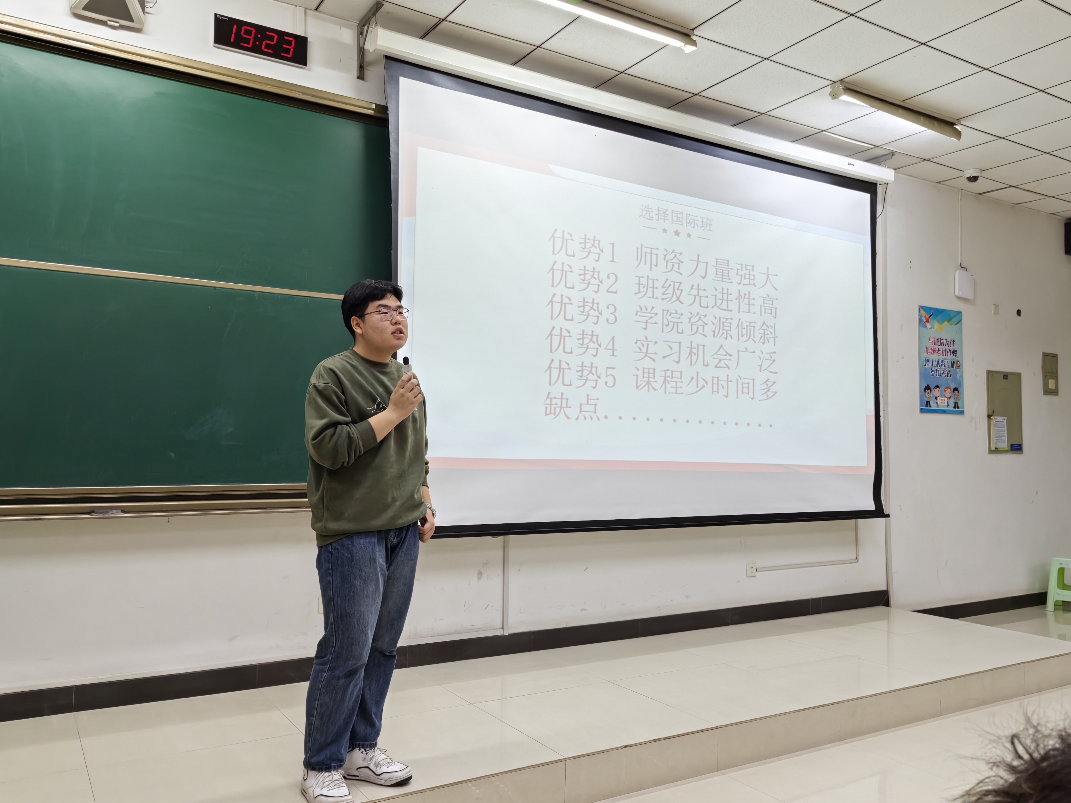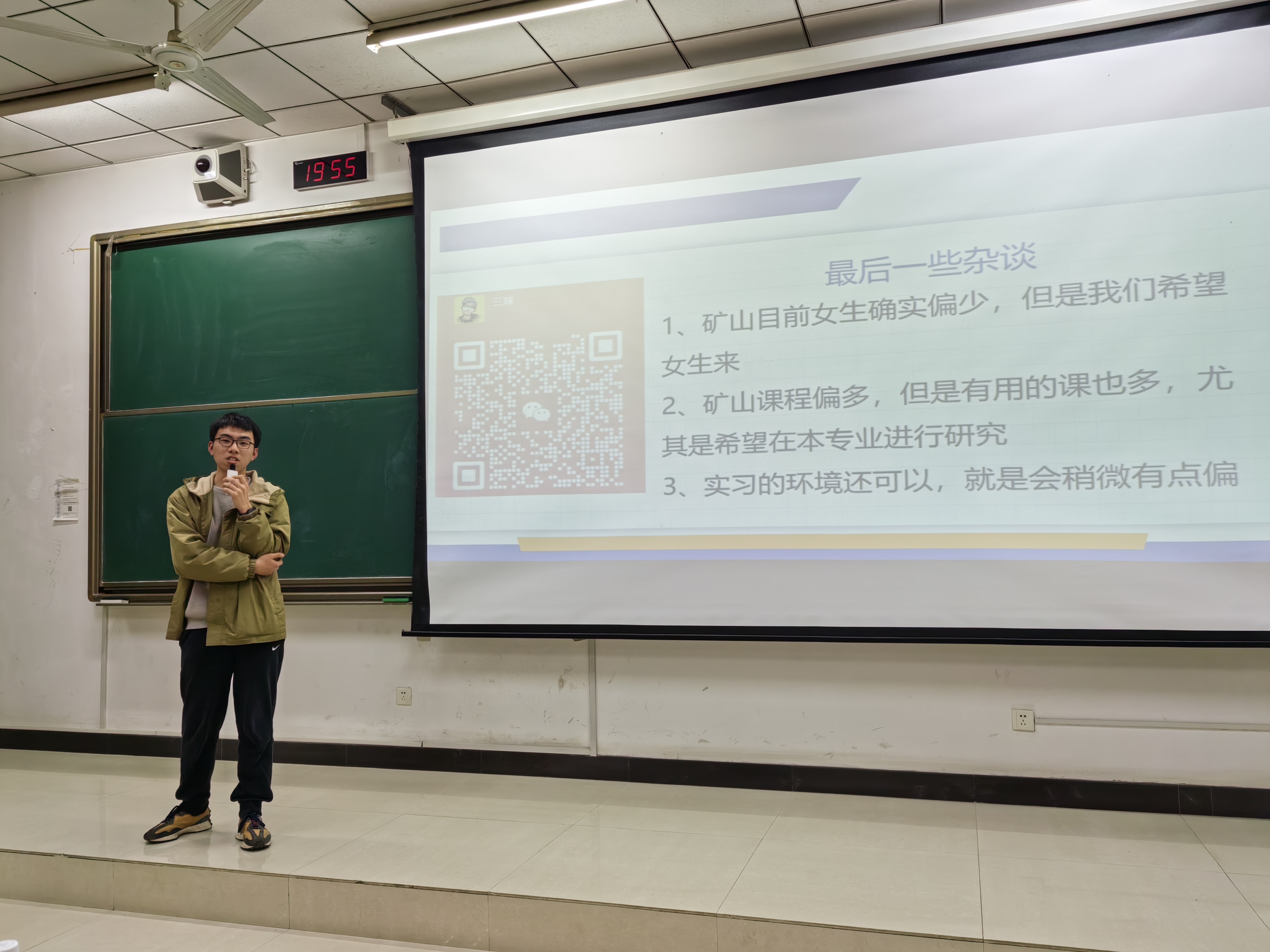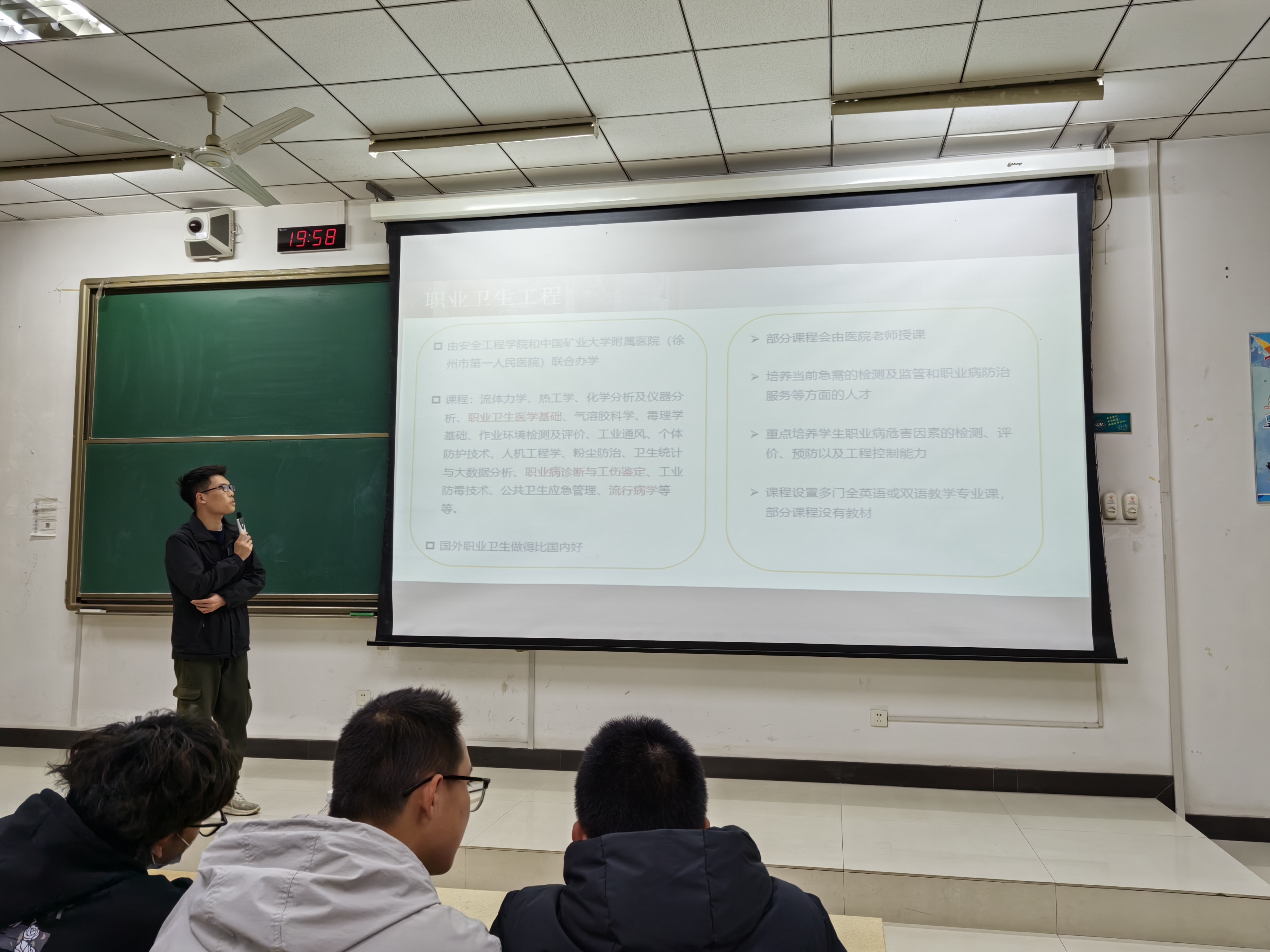 活动伊始,杨腾锐向同学们介绍了国际班的特点,强调了国际班师资力量、班级学风建设、科创氛围、实习实践等独特优势。张正阳向在场学生详细介绍了矿山方向的研究内容,分析了该领域的学科特点和前沿趋势,激发了在场学生的浓厚兴趣。张艺怀从四个方面为同学们讲解工业安全的重要性,通过分享自己的实习经历,介绍了该领域的相关知识和发展趋势。董浩然从多个方面为同学们详细解读了消防工程专业的发展前景和就业形势,鼓励大家要备广泛的知识面和综合素养,积极参与多种活动。黄旭兴从职业卫生工程的定义、发展历程和重要性入手,介绍职业卫生工程的专业内涵及就业前景,深入浅出地解读了该专业的核心内容,鼓励大家树立明确的职业目标,勇敢追求梦想。
