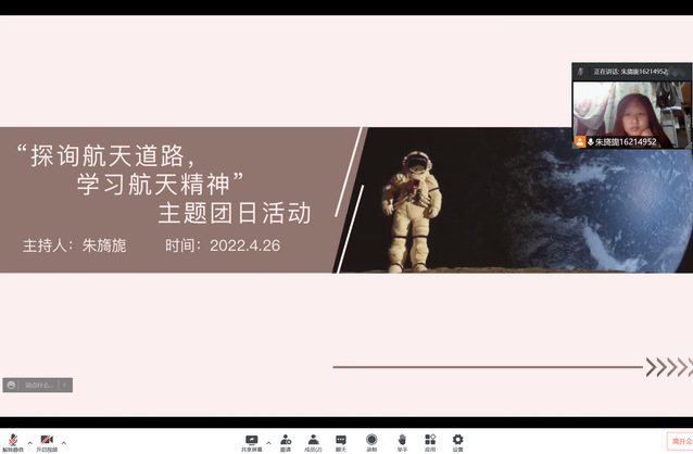 4月24日为中国航天日,为了解中国航天一路走来的艰辛,213班团支部采用线上腾讯会议举行此次活动。团支书朱旖旎为同学们介绍了中国航天近期的新闻将本次活动与实际联系起来接着团支书朱旖旎为同学们播放了《中国空间站的背后》短片让大家了解到中国空间站背后的那些年的辛酸与艰难知道中国航天事业有如今的成就来之不易。此外,团支书朱旖旎带大家了解了中国航天的历史以及重大事件。同时带领大家感悟中国的航天精神。同学们在此次活动中认真听讲,积极发表自己的看法以及感受。