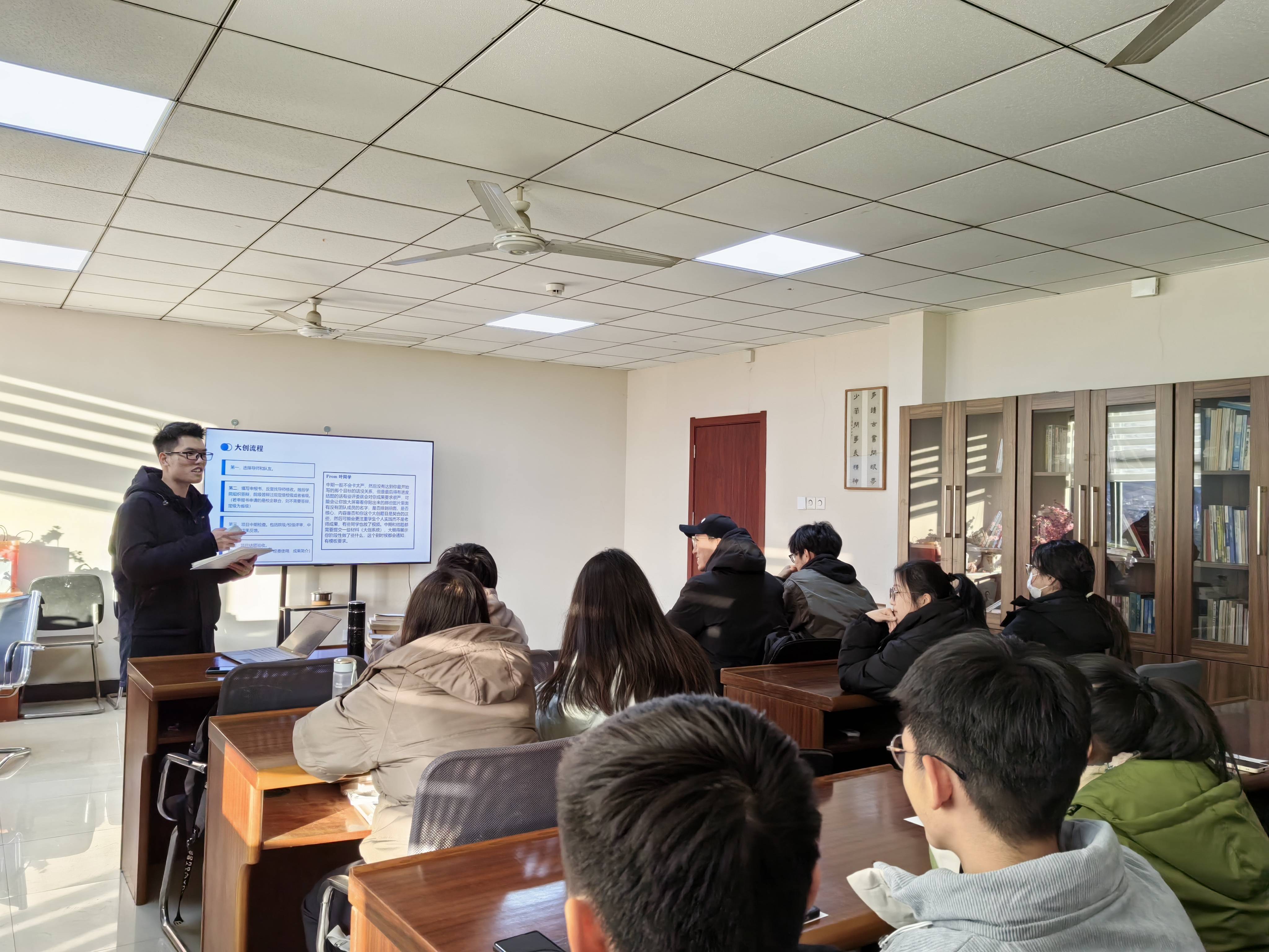 活动伊始,黄旭兴向大家讲解了大学生创新创业项目的申报流程及要点,他结合自身学习经历,为大家讲解了现阶段学习生活需要注意的事项,激发了同学们探索科研的热情。接下来,他针对不同的学科分享自身的总结与方法,帮助大家缓解期末备考压力。随后,他向同学们介绍了大二暑期认识实习的学习经历,鼓励同学们积极参加实习实践活动,在实践中逐步提升综合能力,明确自身的发展方向。最后,黄旭兴向同学们介绍了选择导师的注意事项,鼓励大家勤奋拼搏,追求卓越。