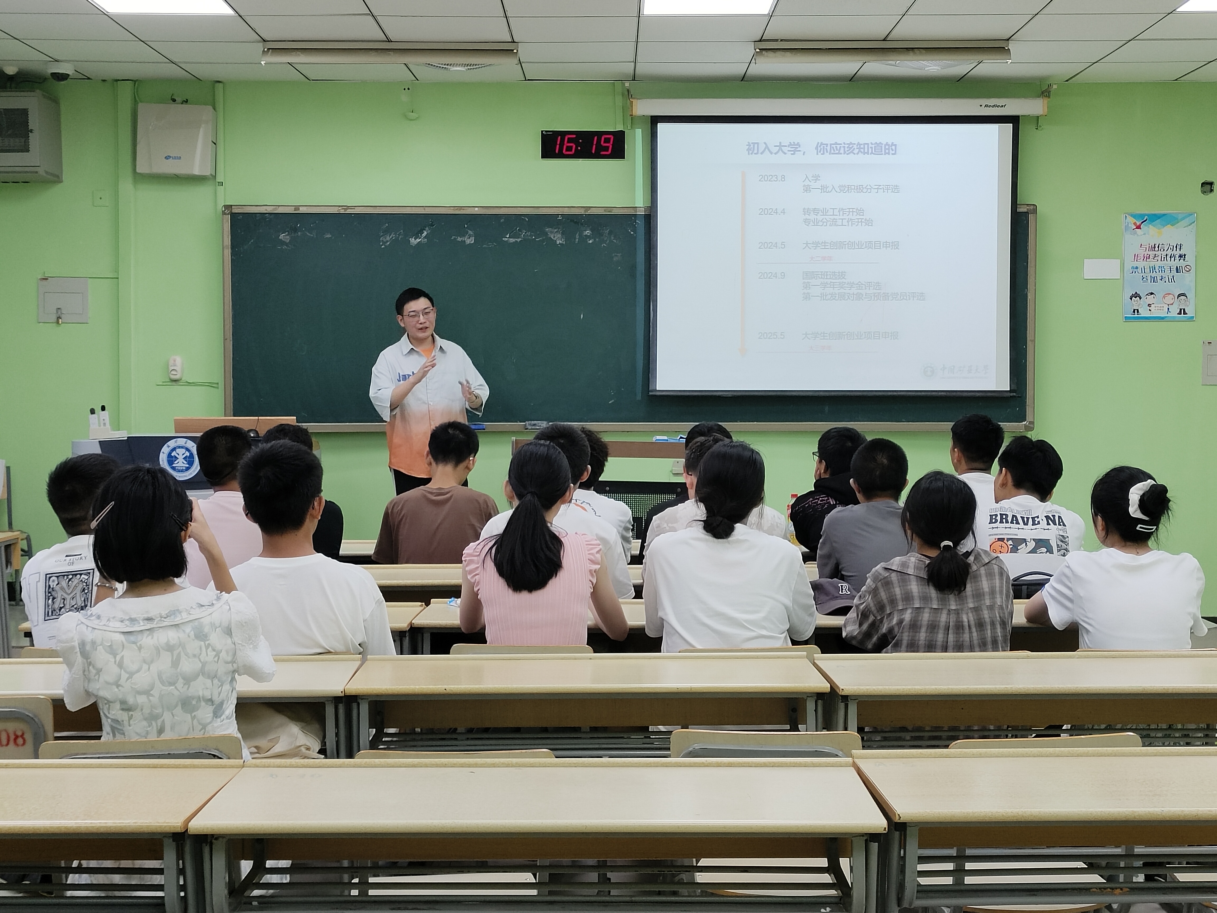 活动伊始,董浩然详细介绍了矿大的衣食住行,分享了大学四年生涯规划的重要时间节点。随后,他结合自身的经验,从学习、科研、学生工作三个方面展开详细讲解,并提出了合理的建议和期望。董浩然鼓励各位新生拓宽个人眼界,勇敢尝试多维活动,在不断试错的过程中提升自己的综合能力;接着,董浩然再次强调保研的基础条件,介绍了专业方向分流和国际班遴选的基础要求;最后,他希望大家制定适合自身的发展计划,尽早确立发展目标,把握时机,成就更好的自己。