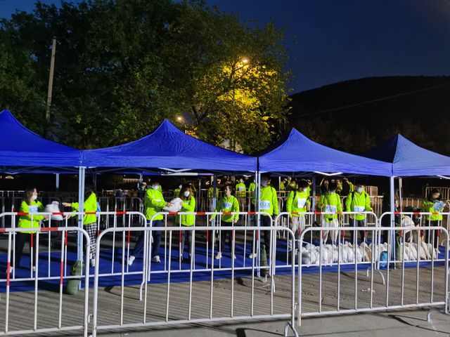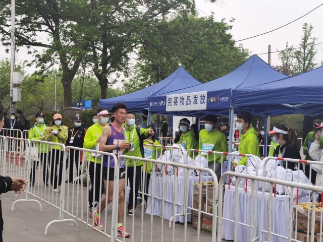 的志愿者负责在徐马半程赛的终点为完赛的远动员发放物资。在参赛选手到达前,志愿者们已经将现场布置完毕,以最好的状态迎接每一位完赛的选手。比赛结束后,志愿者们对现场进行收尾工作。