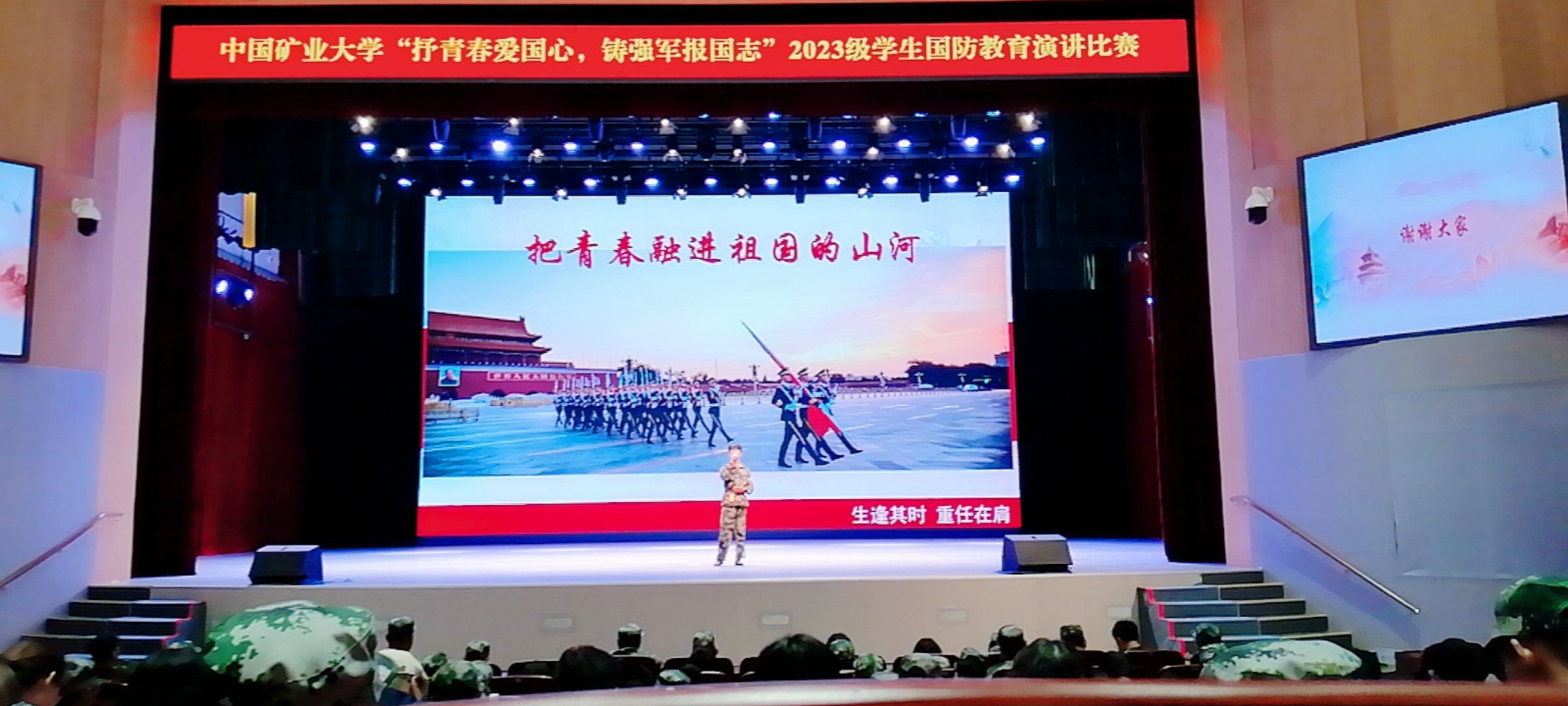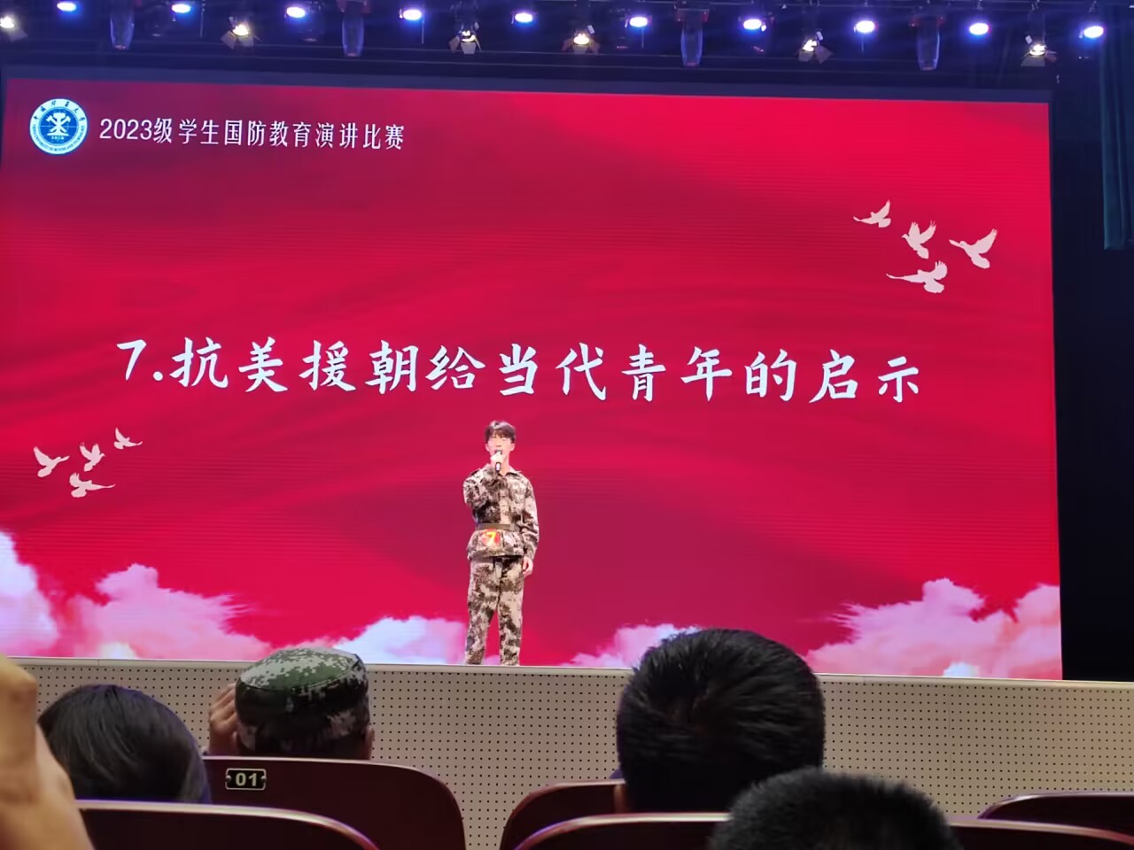 在明德礼堂举办2023级军训演讲比赛。学院2023级新生代表马路博积极参加比赛。
