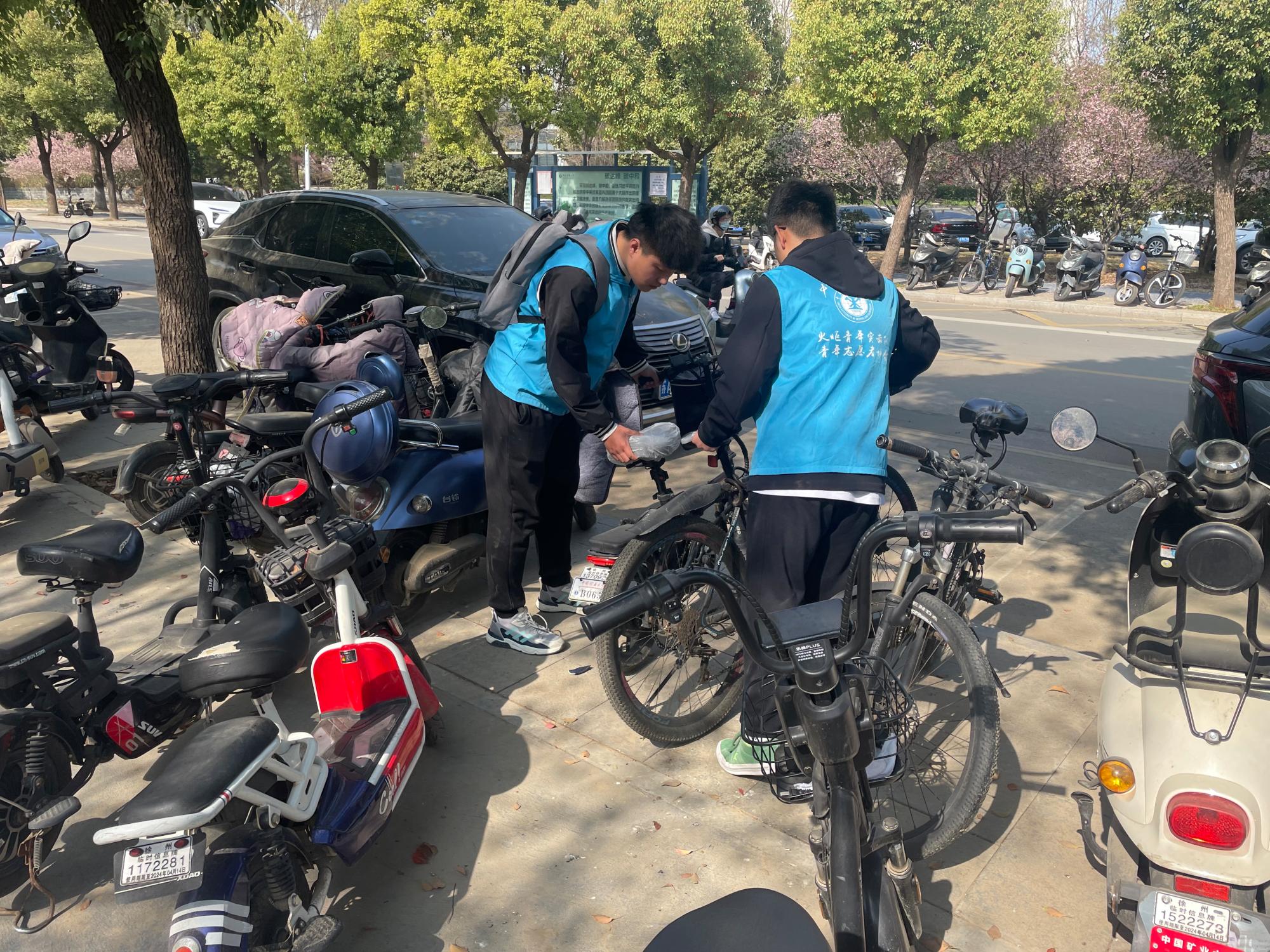 青年志愿者主要负责矿业科学中心附近区域电动车摆放,活动中,志愿者们统一身着蓝色志愿者马甲,将停放区附近乱停乱放的电动单车集中推至规定停放区域,并对停放区电动单车进行统一规范整理。引导骑行者将电动单车摆放到相对集中的停放区域。同时,向过往同学积极宣传文明骑行、有序停放的相关知识,倡导同学们养成文明停放的好习惯。志愿者们共同努力、齐心协力一同将横七竖八的单车摆放整齐,共享单车都整齐的摆放在规定区域,停车区重现整齐之美。