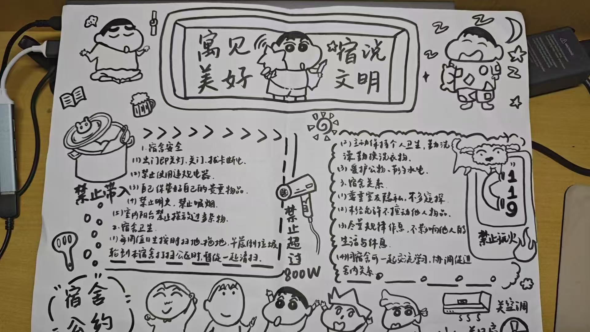 本次大赛参赛成员要绘制手抄报,并于自己的宿舍留下合影。大赛自启动以来,得到了全校师生的广泛关注和积极参与。参赛选手们纷纷发挥创意,通过图文并茂的手抄报形式,展示了各自的宿舍公约。这些公约不仅涵盖了卫生值日表、学习互助墙、安全警示角、作息时间轴等维度,还融入了宿舍特色元素,如舍徽设计、成员卡通形象等,充分体现了同学们对宿舍生活的热爱和对和谐共处的追求。