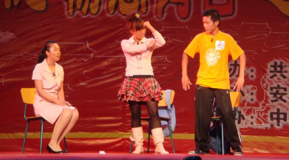 的校十佳歌手熊超献唱的《找自己》引来阵阵叫好;小品《小学 中学 大学》,独具匠心的编排和演员的惟妙惟肖的表演使现场笑声不断;精彩的武术表演《万里长城永不倒》,塑造了中华儿女的英雄气概和千年古韵的威武之躯;一首首耳熟能详的歌曲串烧节目更是将全场的气氛推向了高潮。当歌曲《爱因为在心中》结束后,老师们一起走上舞台,与参加演出的学生们亲切握手。