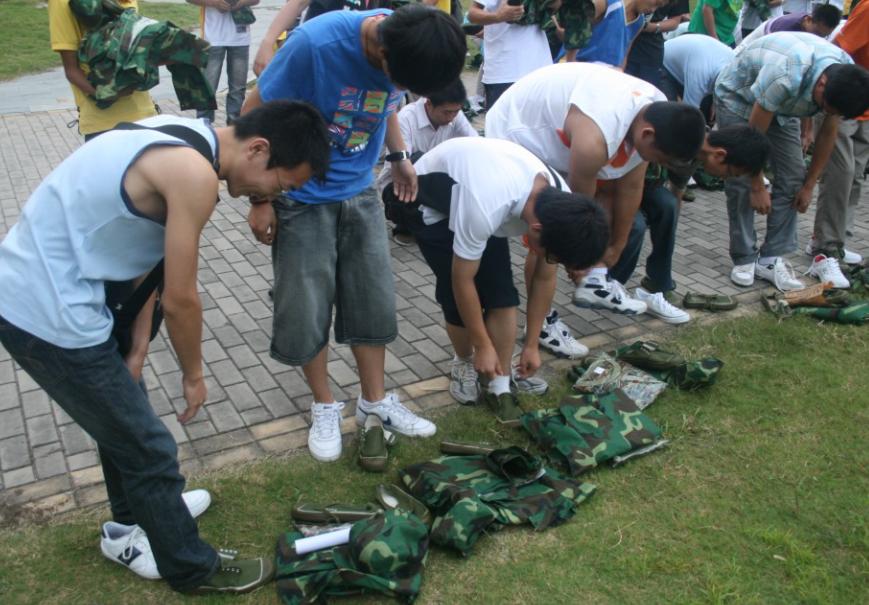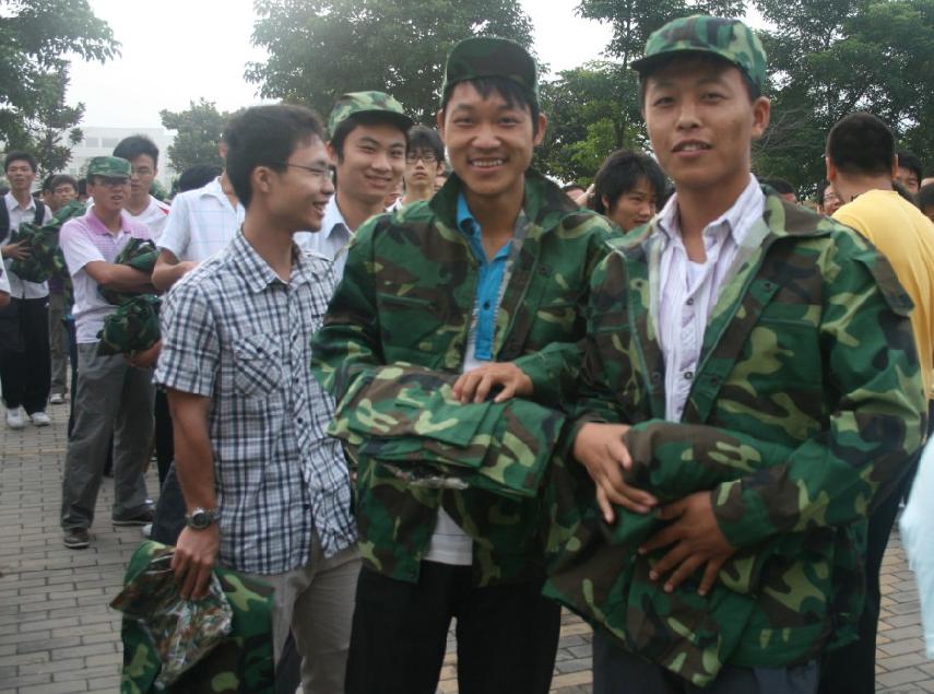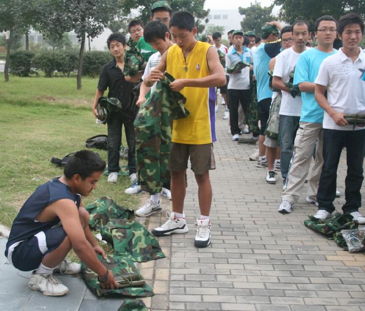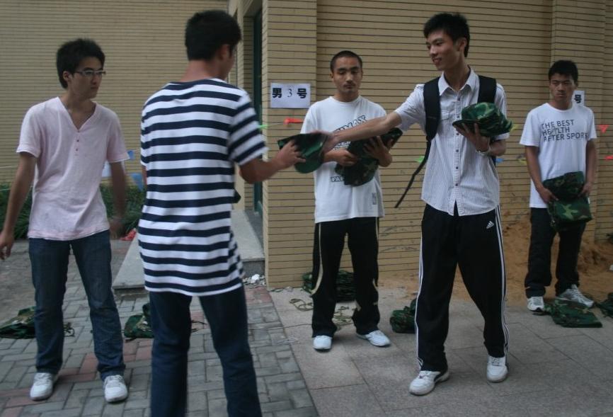 9月5日上午6点,绅士会所 09级新生在团委书记、09级辅导员孙留涛老师以及辅导员陈少松老师和刘筱婕老师的带领下在竹苑3号楼东门前排列着整齐的队伍,领取他们的军训服装。