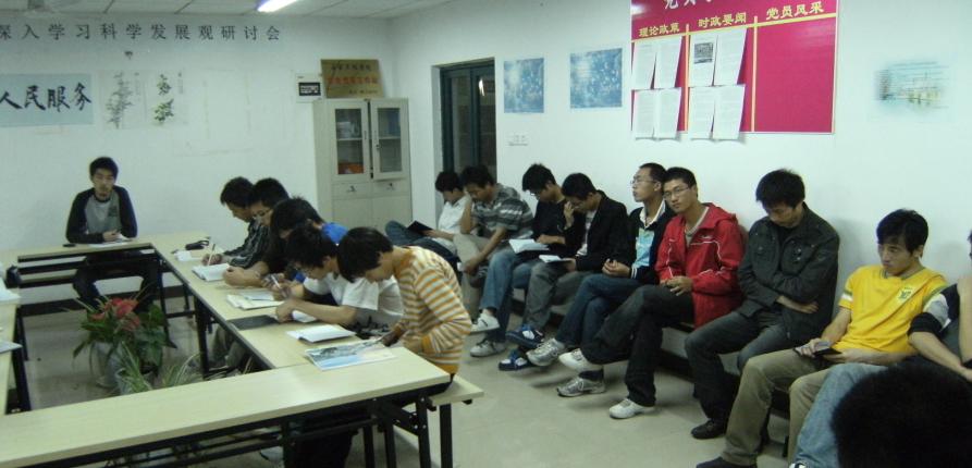 2006级学生党支部积极贯彻实施科学发展观,于2009年5月16日晚在党员工作站召开了专题组织生活会,2006级全体学生党员参加了本次专题生活会。