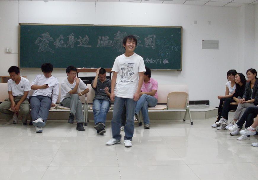 此次班会分三个阶段进行。在第一阶段中,同学们围坐在一起,每个宿舍出一个代表向同学们讲述一下发生在自己身边的一些爱和感动的瞬间。同学们热烈的气氛使整个会场沸沸扬扬,有的同学回顾了自己大学两年来的生活,有的谈到了班级这个大家庭处处充满着温馨,让他们乐在其中,学在其中,还有的同学用最滑稽幽默的语言向同学们讲述了发生在我们身边的一个个搞笑的瞬间。同学们从各个不同的角度诠释了宿舍和班级这个大家庭的温馨和温暖。在一首《朋友》的美妙的旋律中,班会第一阶段顺利完成。
