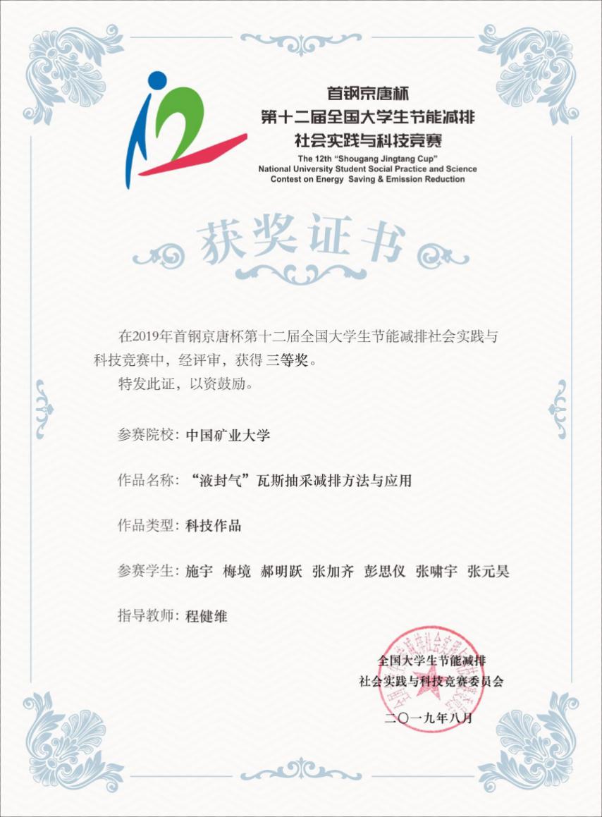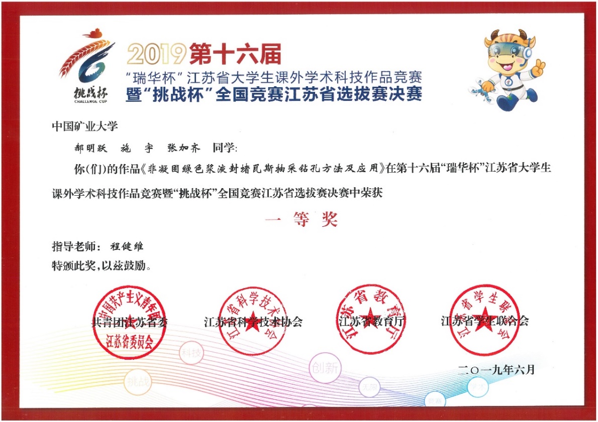 学习期间,他为了提高自己专业知识应用实践能力,积极参与多项大学生创新创业实践竞赛,在竞赛中一次次锻炼自己的综合能力。在他与指导老师的共同努力下,荣获2019年第五届全国高校安全科学与工程大学生实践与创新作品大赛国赛一等奖,2019年第十六届“挑战杯”全国大学生课外学术科技作品竞赛国赛二等奖、省赛一等奖,2019年第十二届大学生节能减排社会实践与科技竞赛国赛三等奖,2019年第五届中国“互联网+”大学生创新创业大赛江苏省赛二、三等奖各一项,2019年第五届全国大学生能源经济学术创意大赛国赛三等奖,2019年第三届绅士会所