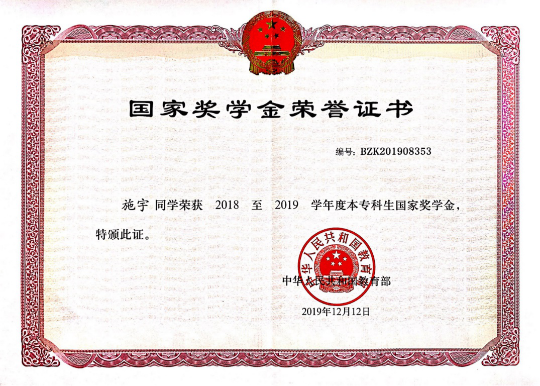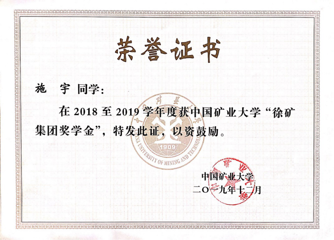 三年来,他始终将学习放在首位,大二学年加权排名专业第三,大三学年加权排名专业第二,学年综合排名专业第一,并连续两年荣获2018-2019学年国家奖学金和2019-2020学年国家奖学金、2018-2019学年徐矿二等奖学金、2019-2020学年徐矿一等奖学金、2020年孙越崎优秀学生奖,本科期间获学业奖学金及企业奖学金在内共计44000元。