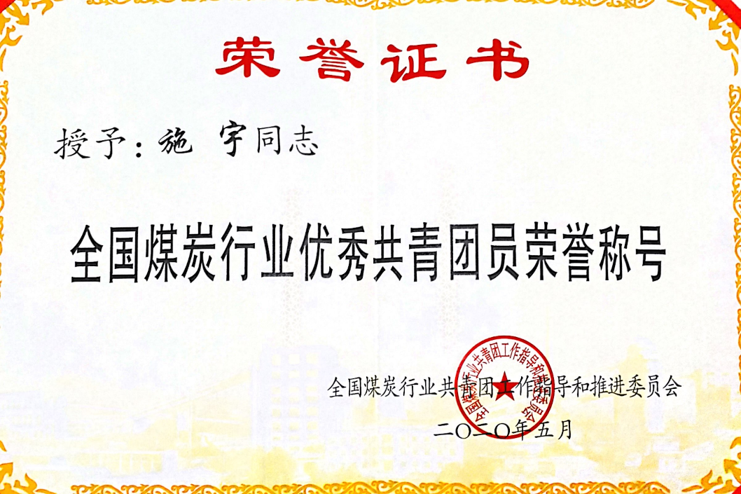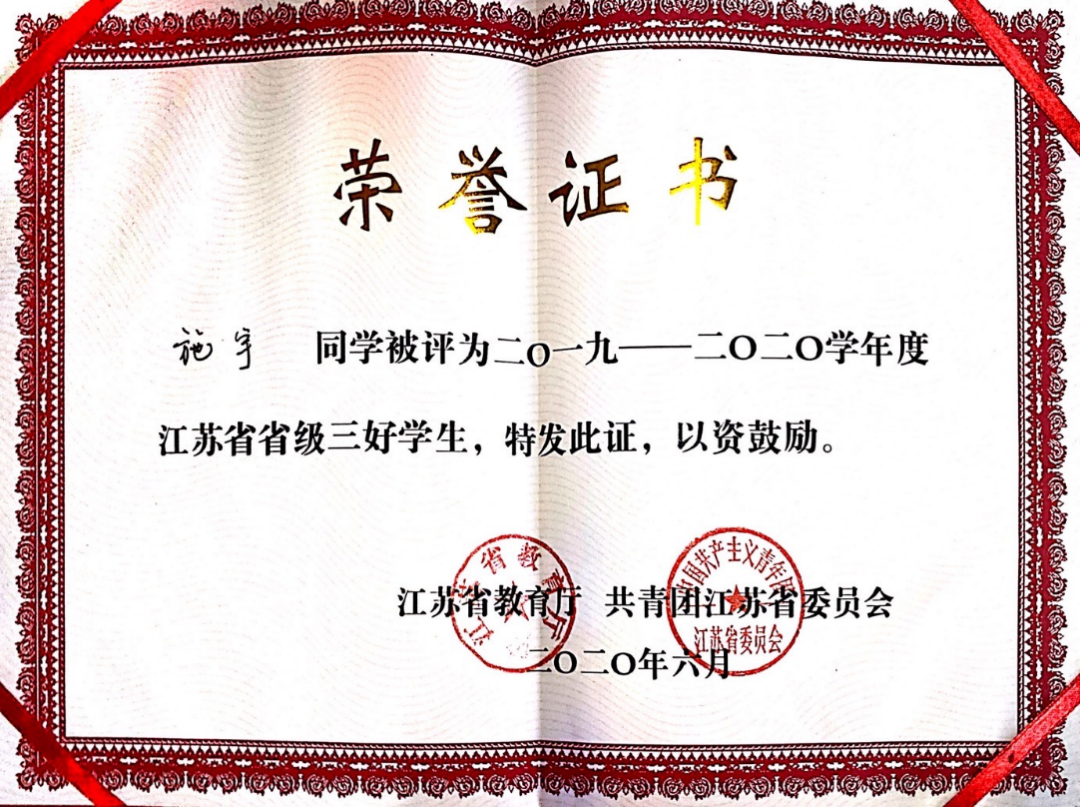 主要荣誉:两次荣获国家奖学金,徐矿企业奖学金和孙越崎优秀学生奖,全国煤炭行业优秀共青团员和江苏省省级三好学生,2019年第五届安全科学实践与创新作品大赛国赛一等奖,2019年第十六届“挑战杯”全国大学生课外学术科技作品竞赛国赛二等奖,2019年第十二届大学生节能减排社会实践与科技竞赛国赛三等奖等,连续三年获评校级优秀学生干部和校级优秀共青团干