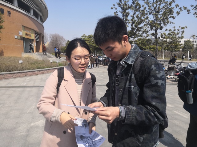 青年志愿者协会服务分队的学生干事和安全学院的志愿者们在三食堂广场进行了关于“宿舍植树节”的宣传活动。