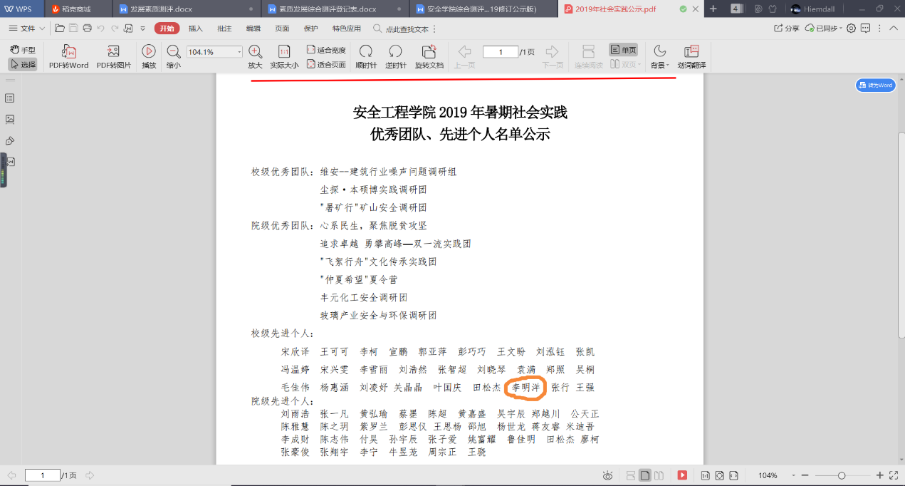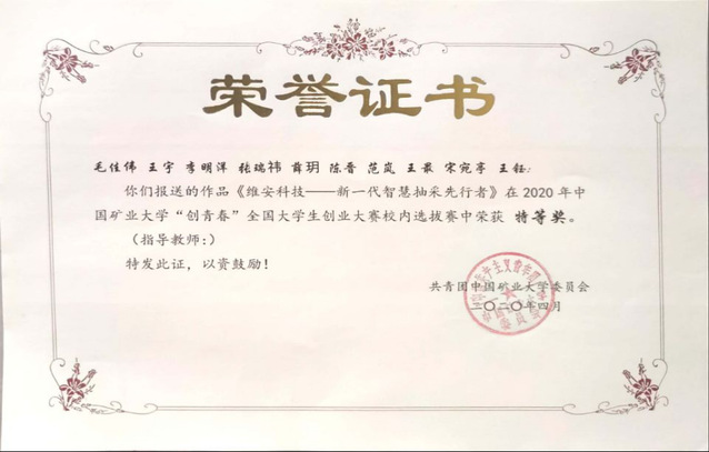 社会实践先进个人,安全学院优秀学生干部等荣誉;两年来我共获得校级及以上奖项10多项,志愿服务时长90多小时。科研创新方面,我参与2020年创青春大学生创业计划赛,并取得了校内选拔赛特等奖的优异成绩,参与徐州市创新创业大赛,取得市级二等奖,现主持校级大创项目一项。此外,我积极参加社会实习,于2018年暑假前往中国科学技术大学进行主题为安全工程学科人才培养的交流学习、2019年暑假和组内成员合作进行了对长江三角洲疫情之后复工复产情况的社会实践调研。