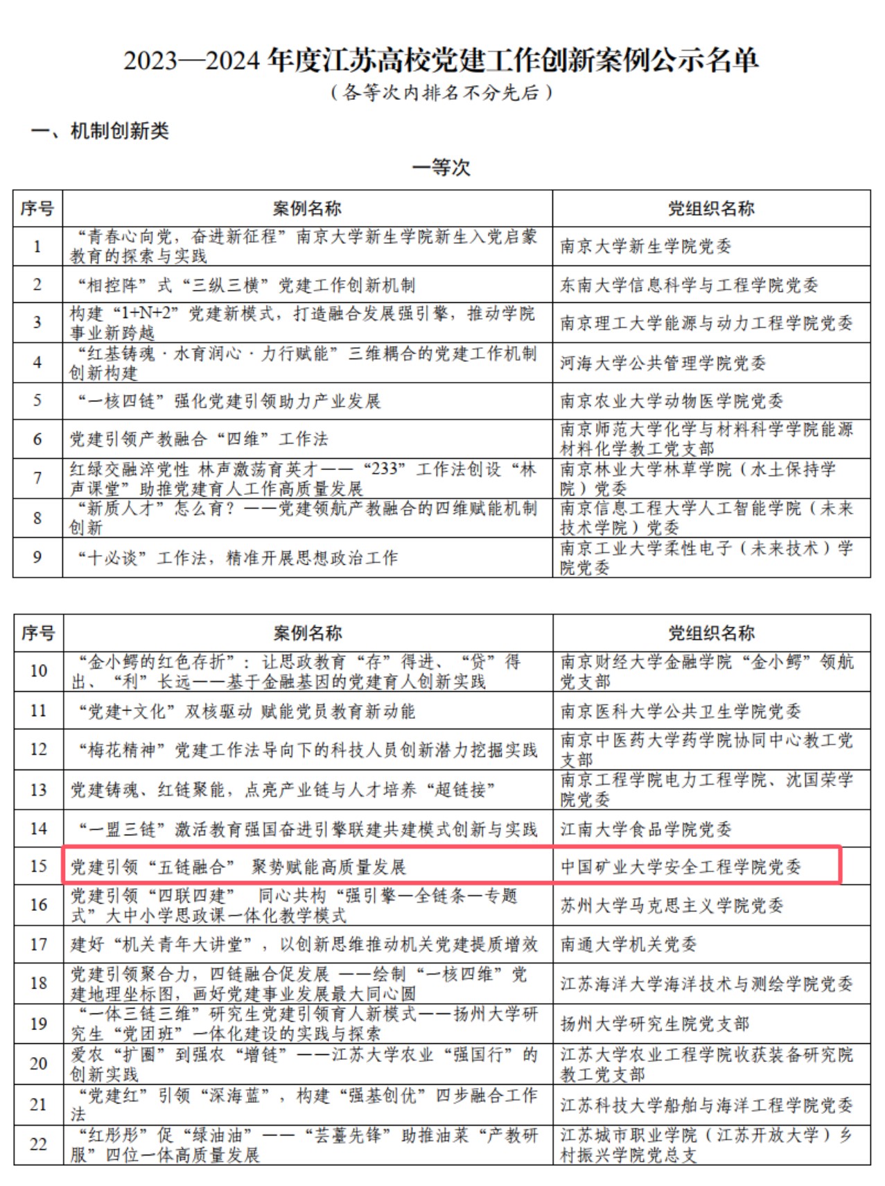 日前,江苏省委教育工委公布了2023—2024年度江苏高校党建工作创新案例名单,学院党委上报的《党建引领五链融合聚势赋能高质量发展》荣获机制创新类案例一等次。