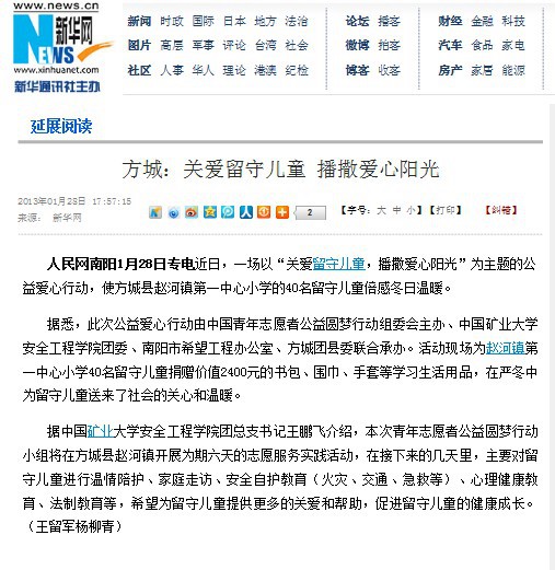 第八届“青春矿大校园年度人物”颁奖典礼在校图书馆一楼报告厅中隆重举行。校党委副书记曹德欣等学校和部门领导出席了此次颁奖典礼。安全学院的10级学生王鹏飞作为中国青年志愿者公益圆梦行动A23项“关爱留守儿童,播洒爱心阳光”项目的负责人,凭借其在“反哺家乡,回报社会”公益活动中的突出表现,荣获本届“青春矿大校园年度人物”称号。