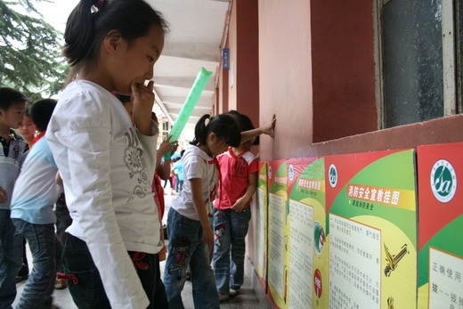 青协的志愿者们抵达矿大附小。在与学校老师协调好后,志愿者们拉出了“提高安全意识,共筑和谐校园”的横幅,并在教学楼一楼走廊摆放好校园消防安全知识的宣传板,向小学生们展示了有关火灾、自然灾害、校园暴力等突发状况下的自我保护措施及逃生方案。之后,志愿者们联系了学校相关老师向全校各班发放并张贴了有关校园消防安全及学生自救方面知识的宣传海报,以便学生们长期学习。小学生们纷纷驻足观看,并好奇地向志愿者们提出很多问题。志愿者们耐心地听取问题并进行一一解答。