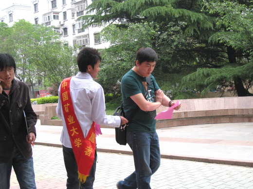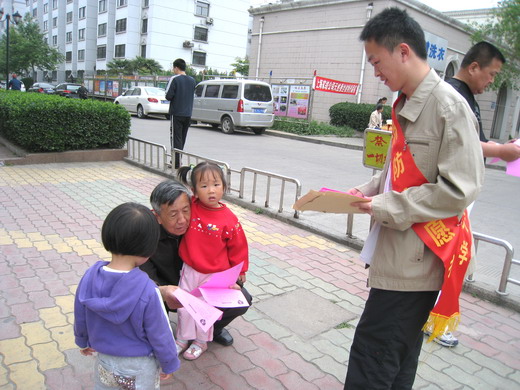 在与社区物业人员协调好后,志愿者们拉出“减灾从社区做起”的横幅,吸引了社区居民的注意。四位同学分头进行宣传,分发给社区居民宣传单,并仔细讲解为何要防灾,针对不同的人不同的环境要怎样防灾。居民们对于防灾减灾知识的宣传相当认欢迎,并积极询问志愿者自己困惑的地方。最难得的是一位年过八旬手脚都已不灵便的老奶奶从志愿者手中接过宣传单,仔细阅读后,主动向志愿者咨询疑问,得到解答后满意地离开。