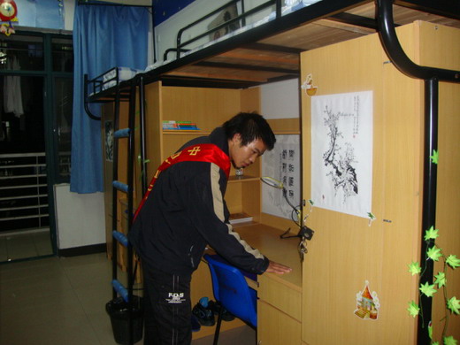 组长斐雄飞首先强调本次宿舍卫生检查以阳台.卫生间.地面.桌面.被褥为主,并将结果分为ABCD四个等级。督查部的小组成员依次走进09级同学的宿舍,严格按照组长要求展开全面检查。刚经过军训的09级同学显然保持了良好的卫生习惯,被褥整齐,菱角分明,桌面洁净,物品摆放有序,地面纤尘不染,阳台干爽开阔。08级的同学相比较而言稍微差一点,整体看来仍是物品摆放整齐,被褥叠放有序,地面清洁无杂物。