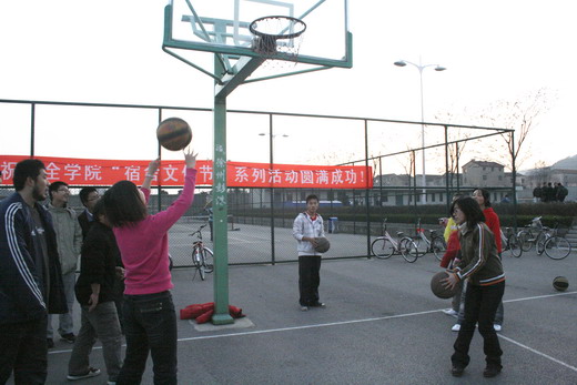 参加本次趣味运动会的宿舍共有25个,分成9个小组,每一组由4名同学组成。每个参赛小组的首先进行的环节氏男生100米、女生50米短跑,紧接着由第二名同学连续跳绳20次,之后第三名同学迅速连踢10个毽子。只见踢完毽子的同学抱起篮球就飞奔向篮球场,比赛进入最后一个环节投球比赛:男生站在罚球线处可累计进球5次,女生在任一位置处投篮进框3次。整个接力赛程中用时最少的队伍即为获胜者。赛场上每位参赛同学都竭尽全力,他们风一般的速度、灵巧的身姿、娴熟的技艺不禁让大家惊叹。