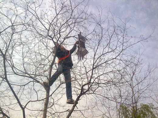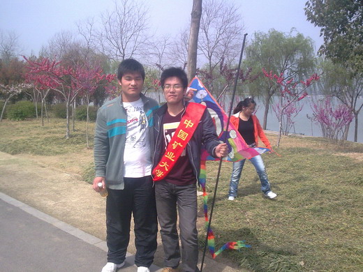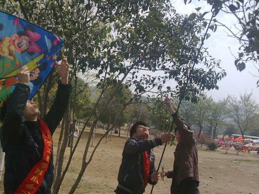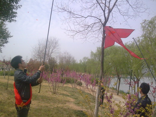 服务分队D组成员在小南湖畔举行校外服务活动,帮助放风筝的人们把挂在树上的风筝摘下来。