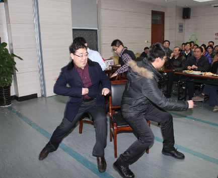 在联欢会开始之前,院工会主席李忠辉代表工会向全体教职工致以新春的祝福,对一年来辛勤工作在学院教学、科研、管理、技术服务等各方面的教职工表示了感谢。联欢会设计了互动游戏环节及抽奖环节,互动游戏集趣味性及运动性于一体,包括:抢凳子、Dancing copy、横劈叉等项目,各活动采用小组比赛形式,院领导与教职工均积极参与,在欢乐中共同完成了互动游戏,通过这些互动游戏使老师们增进了友谊和了解,增加了乐趣,放松了身心。在游戏间隙安排的抽奖活动虽然只是给教职工准备了一些并不昂贵的礼品,但热烈的过程将联欢会的气氛推向了一个又一个高潮。