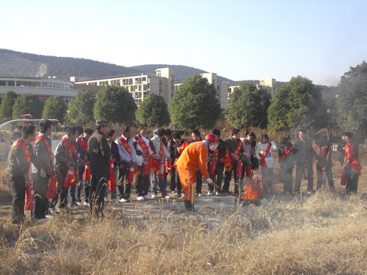 消防志愿者们在灭火演练场地集合并在老师安排下按要求安放好火盆、干粉灭火器等灭火演练设施。时至3:00.,演练正式开始。在绅士会所