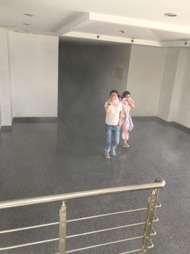 14:10,模拟火情扩大开展紧急疏散。工作人员在楼内用发烟罐释放烟雾模拟火灾,同时打开报警装置。随着“火灾”警哨声的响起,各楼层疏散引导员按预设消防演练活动方案迅速到位,大喊“火警,马上撤离!”,引导参加演练的师生用毛巾沾水捂住口鼻,沿着各个逃生楼道有序下楼,并到达指定安全位置。