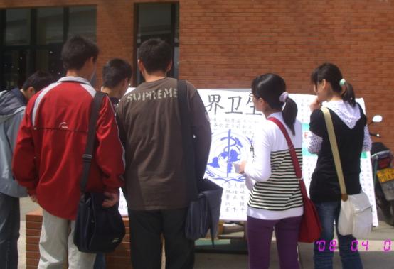 同学了解一些关于世界卫生日的知识,切实关注自己的身心健康,创造良好的校园环境。 4月7日中午,由校学生会生活部主办、安全学院学生会生活部承办的“创建卫生校园,保障健康生活”活动在二食堂广场成功举办。