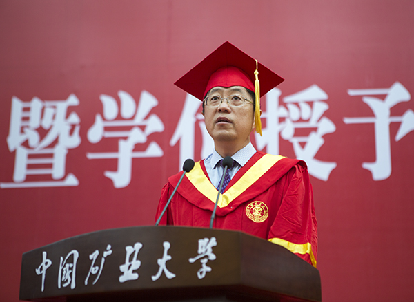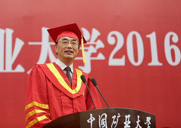 葛世荣校长发表了讲话。他说,对于学生而言,矿大不一定是最向往的,但一定是最难忘的;矿大不一定是最满意的,但一定是最关键的;矿大不一定是知名度最高的,但一定是最努力的。他大量列举了今年的优秀毕业生,并坦诚地表示,与同学期望和愿景相比,矿大的培养质量还存在着不小的差距,要把同学们的满意作为鼓励,继续保持下去,要把同学们的不满意作为鞭策,及时改进完善,努力创办世界第一的矿业大学。学生即将离开母校,游学四海,建树八方,葛世荣校长还表示,作为师长和朋友,有三句走心的话送给大家,概括为“三个不后悔”,即一是不因青春无为而后悔,二是不因辜负父母而后悔,三是不因淡忘母校而后悔。致辞满含深情、语重心长,不断被毕业生热烈的掌声、欢呼声打断。