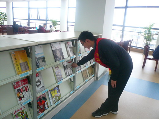 在活动负责人郭良军、侯文泉两位同学的带领下,服务分队的同学们每天分两个时段来到图书馆报刊阅览室进行杂志归位工作。在为期一个月的时间内,每天下午四点到六点都会有四位同学来到阅览室值班,主要负责在晚餐时段把同学们遗落在桌子上的报刊杂志归位。每晚九点到九点四十,同学们会再次到报刊阅览室进行杂志归位和校对的工作。服务分队同学们认真的工作态度和良好的工作效果也给图书馆内的工作人员留下了很好的印象。