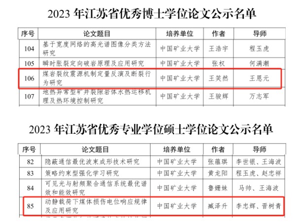 硕士研究生臧泽升(导师李忠辉)的学位论文《动静载荷下煤体损伤电位响应规律及应用研究》被评为2023年江苏省优秀专业学位硕士学位论文。
