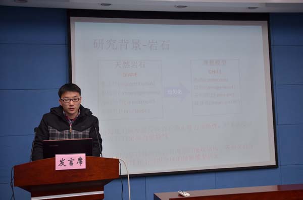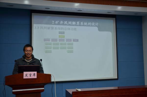 在经过主持人李俊毅的简短介绍后,来自2012级的研究生李浩威、韩宗建、蔡维维、谢兵兵、戴韬、焦汉林分别就各自的研究领域做了相关学术报告。首先由李浩威与大家分享他的研究成果,报告题目是“应用均衡通风原理优化矿井通风系统”,在他的报告中,以运河煤矿为例,结合均衡通风原理,向大家介绍了煤矿风网解算系统的设计与现状模拟研究。随后韩宗建向大家讲述了 “贵州马依西煤矿北风井揭煤防突技术研究”,介绍了如何将FLAC-3D软件应用在揭煤工作面上,同时介绍了渐进式揭煤方法在北风井的运用。蔡维维的报告题目是“薄型可燃物竖向燃烧实验与数值模拟研究”,她结合竖向燃烧火灾实验和数值模拟研究了薄型可燃物竖向燃烧规律。谢兵兵、戴韬和焦汉林的报告主题分别为“矿井通风自修复监测分析研究及应用”、“真实非均质岩石细观数值模型建立方法”和“初采期瓦斯涌出规律及治理技术研究”。