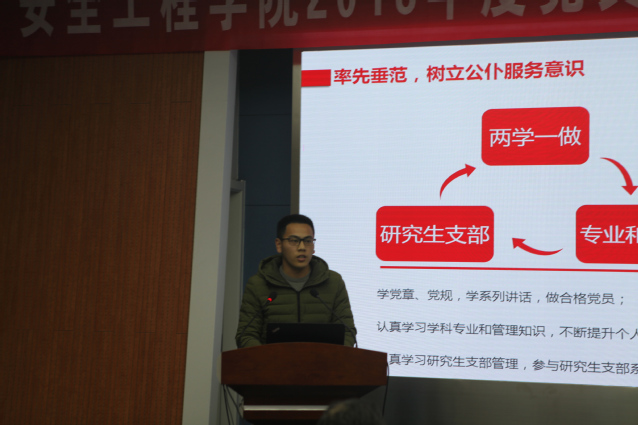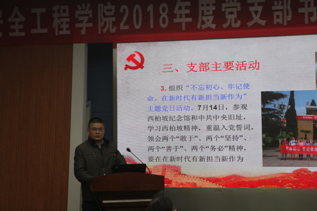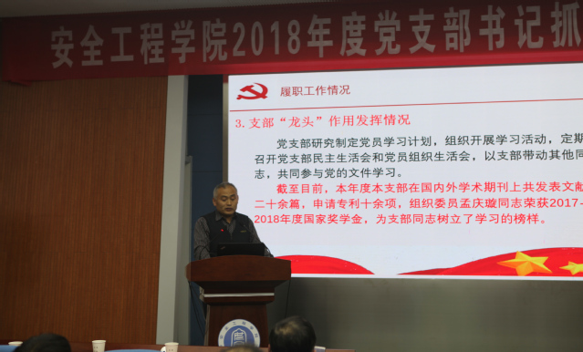 章毛平书记对述职评议大会做了总结。他与大家一起再次重温了党的十九大报告中“把党的政治建设摆在首位”和“加强党的基层组织建设”等关于从严治党的相关内容,结合当前和今后一个时期学院党建工作的特点,对加强和改进安全学院基层支部书记抓党建工作提出了五点要求,一是要始终将政治标准放在首位;二是要进一步推进党支部的标准化规范化建设;三是党支部书记要按照“双带头人”标准严格要求自己;四是创新活动方式更好地体现党组织的生命力;五是牢固树立“围绕中心抓党建、抓好党建促发展、发展成果验党建”的理念,为实现双一流建设目标不懈奋斗。
