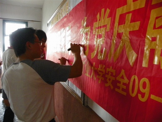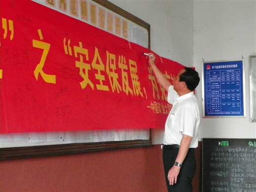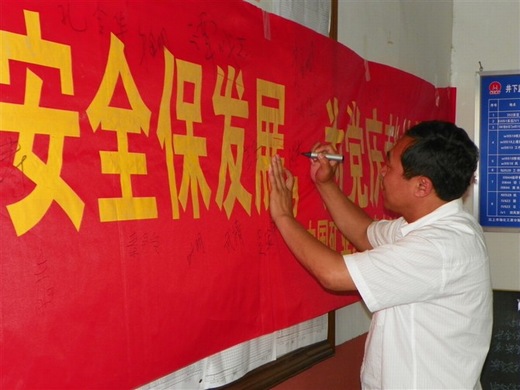 首先,实践团来到作为煤矿安全保障心脏地带的通风区,积极地和通风区的领导、工人进行交流,了解他们的安全举措和安全管理方针。矿区领导介绍道,该部门为确保安全生产,一贯坚持“软硬件同发展”的方针。软件上,通风区定期给员工进行集体培训,实施安全生产奖励制度,提高工人们注重安全的积极性;硬件上,通风区更是不断更新设备,引进新技术,为安全生产提供了安全的硬件保障。在与矿区领导交流的过程中,实践团也积极宣传安全常识和安全的重要性,并积极为煤矿安全生产献计献策。在随后的签字活动中,矿区领导和工人们积极地配合实践团的活动,在长长的横幅上签上了自己的名字,和实践团全体成员一起表达对煤矿实现安全生产,为建党九十周年献礼的美好祝愿。随后,实践团又来到其他科室和矿区积极开展了确保安全生产主题签字活动,得到了诸多支持。